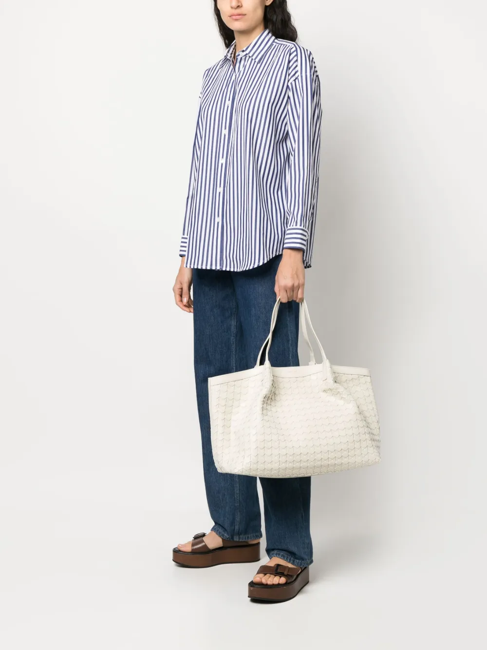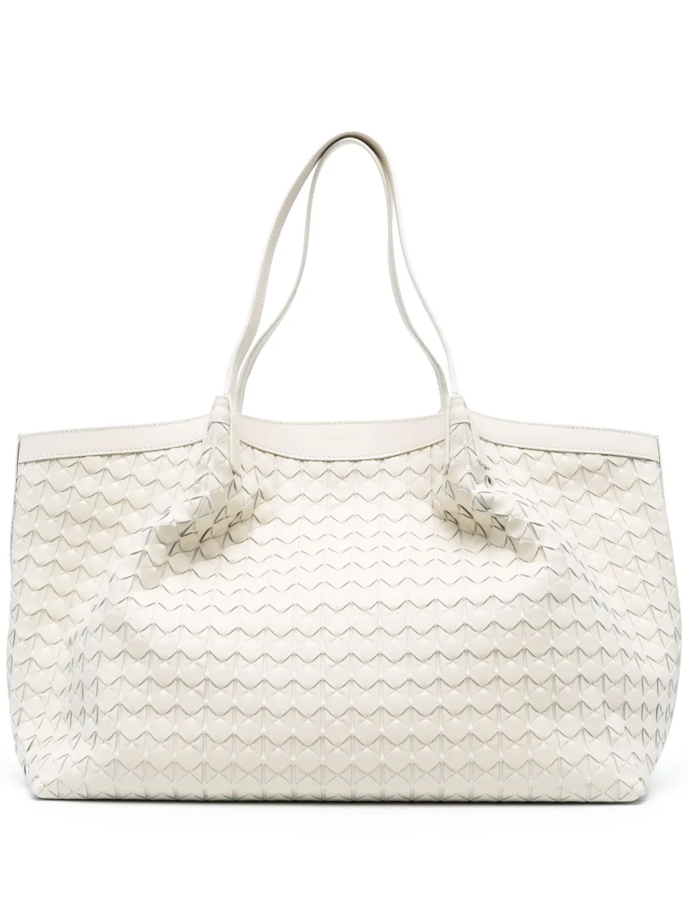 Кремовый, телячья кожа, фактурная отделка, логотип спереди, две плоские верхние ручки, потайная застежка на кнопках, основное отделение и внутренний карман на молнии.