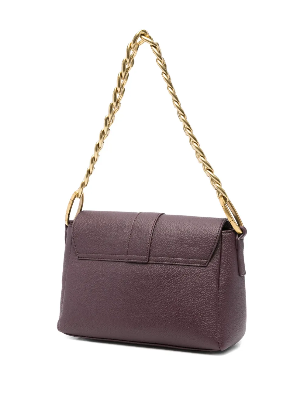 Красная зернистая отделка, фурнитура золотистого оттенка, верхняя ручка-цепочка, съемный плечевой ремень, передние карманы, логотип-надпись