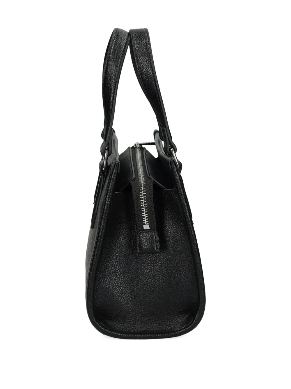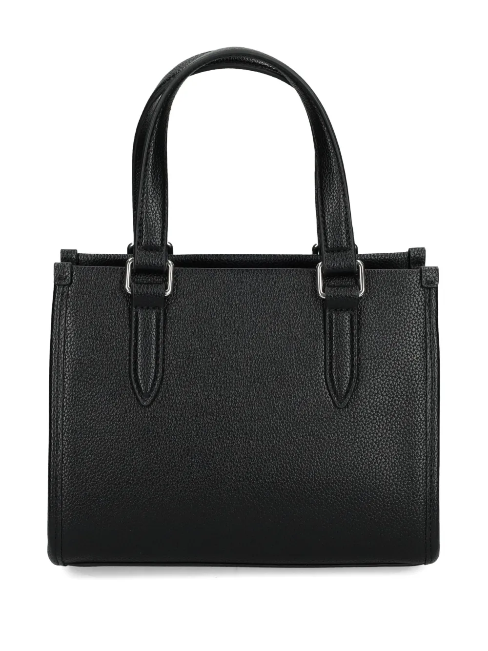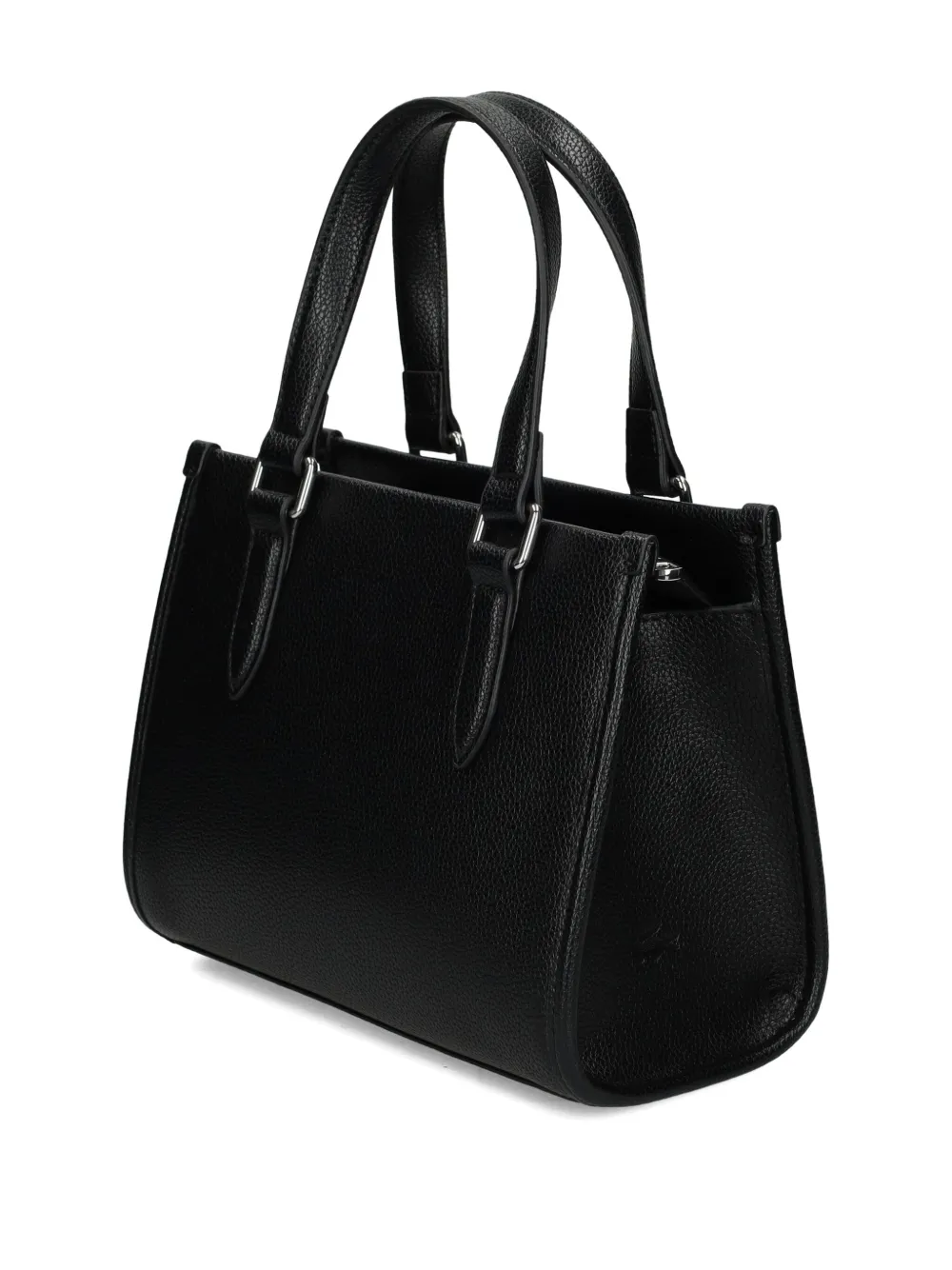 Черные верхние ручки, застежка на молнии, плечевой ремень, логотип в виде надписи, фурнитура серебристого цвета