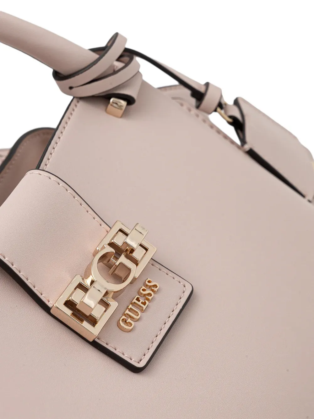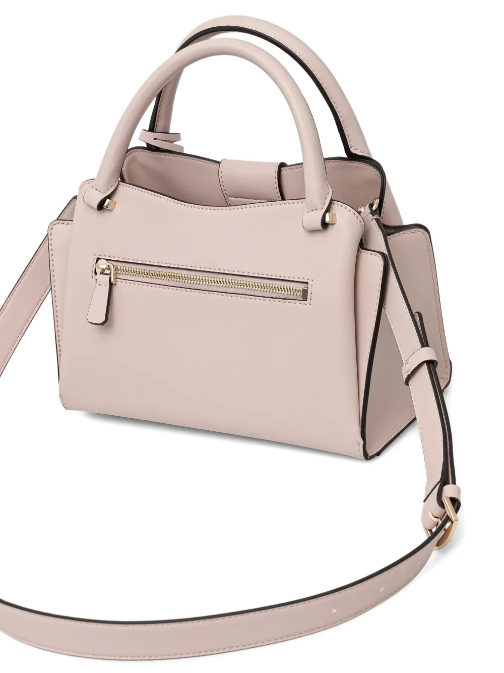Светло-розовые верхние ручки, съемный плечевой ремень, фурнитура с золотистым покрытием, табличка с логотипом, застежка-молния