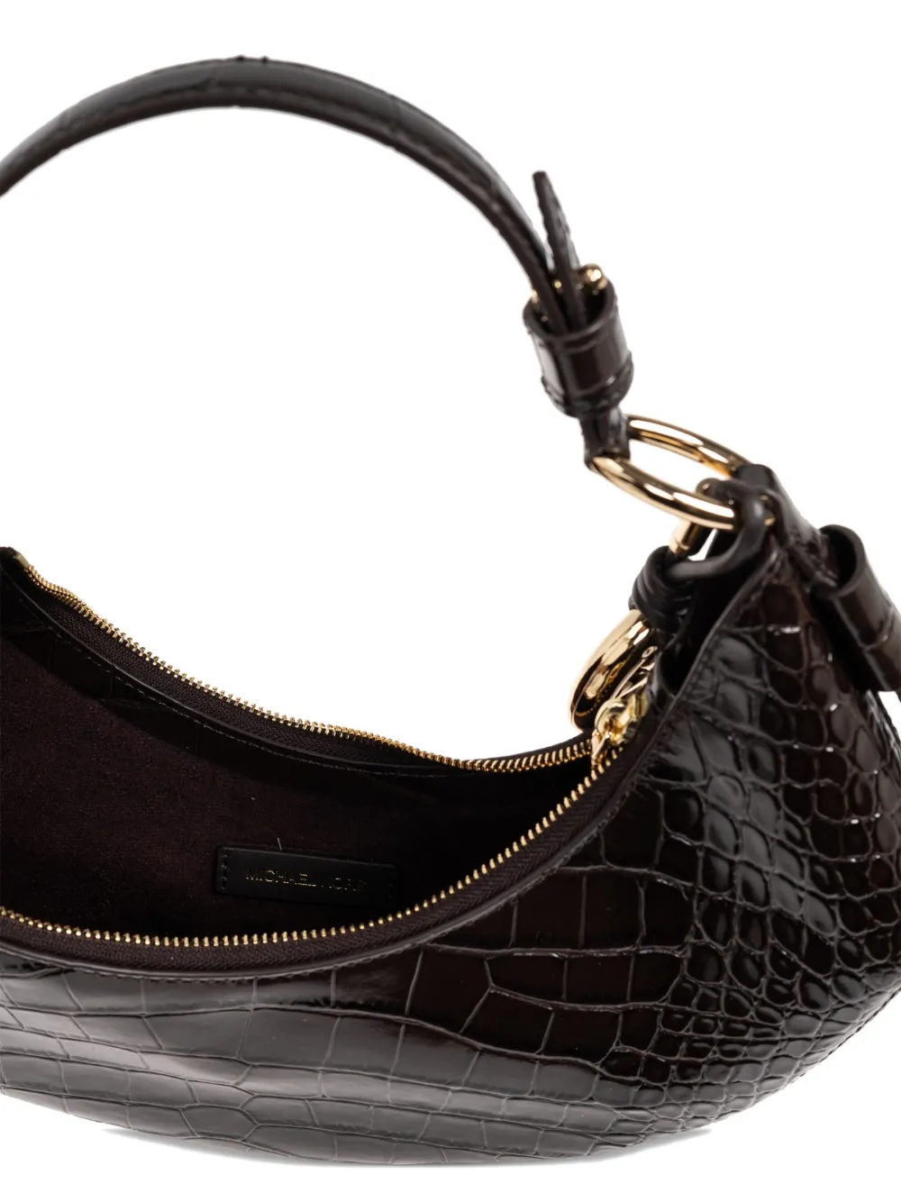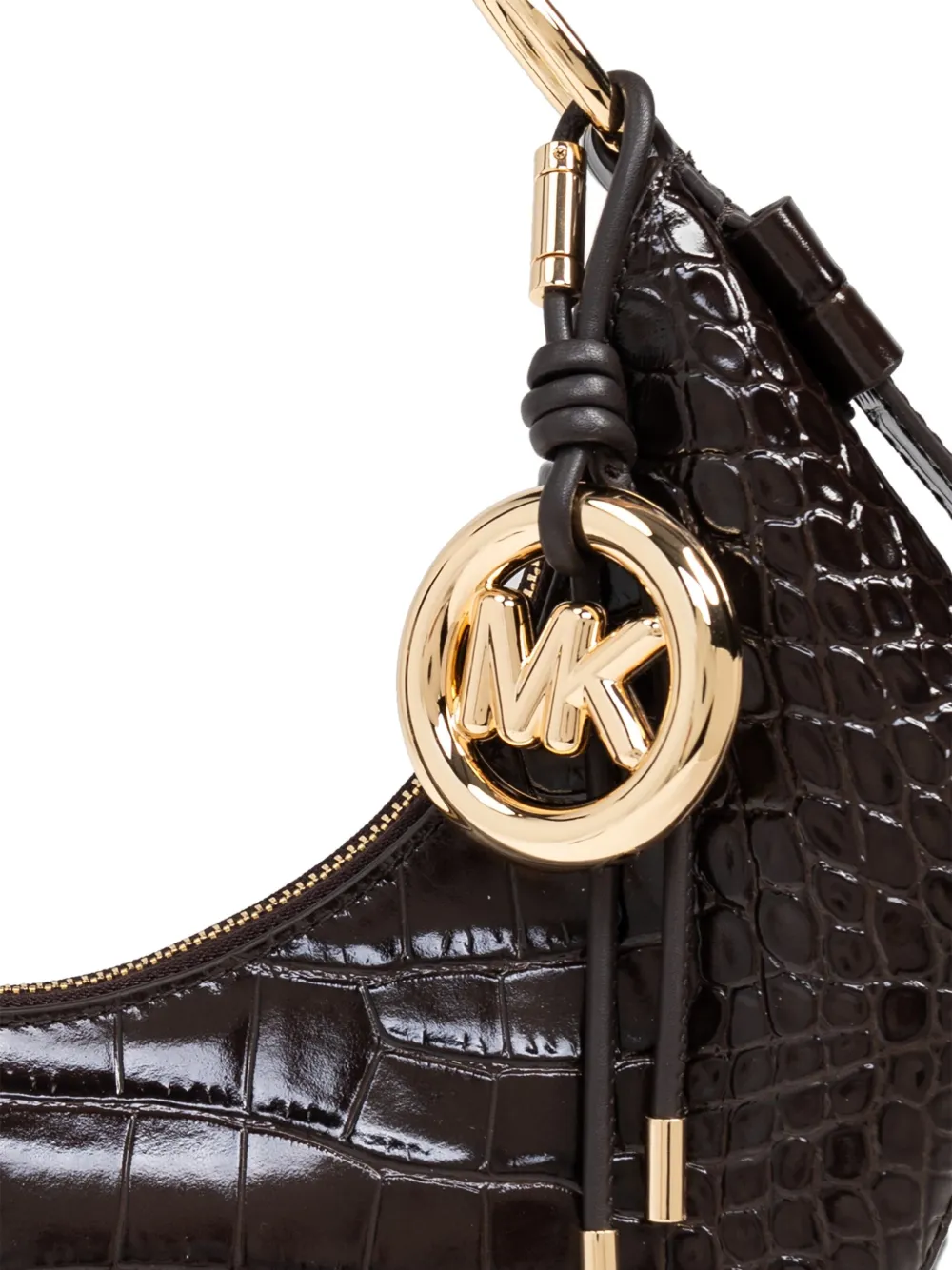 Коричневая сумка с тиснением под крокодила, регулируемой верхней ручкой, фурнитурой золотистого цвета, брелоком с логотипом, застежкой-молнией и основным отделением