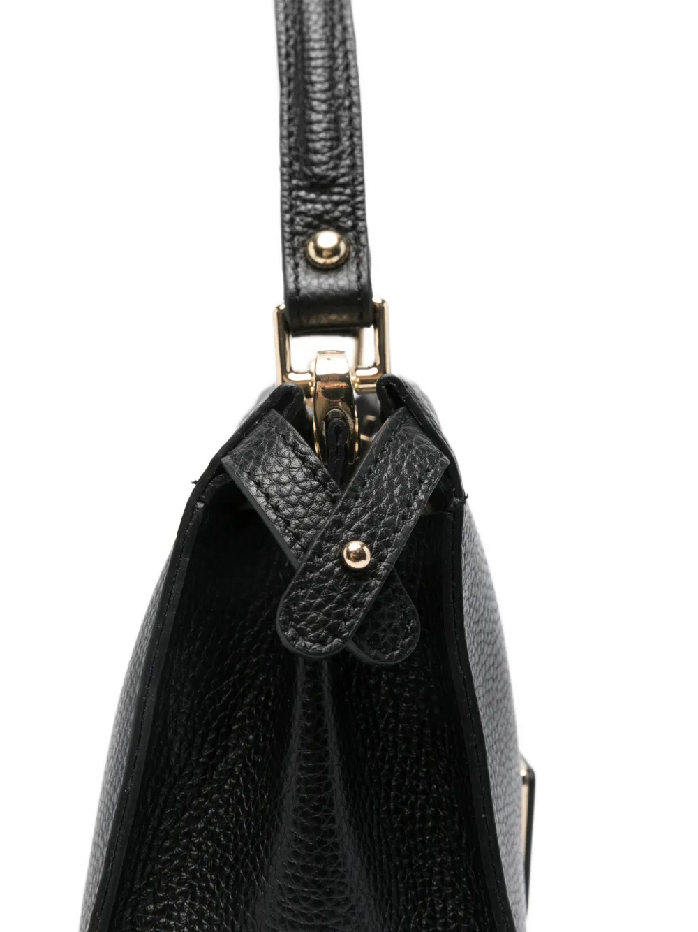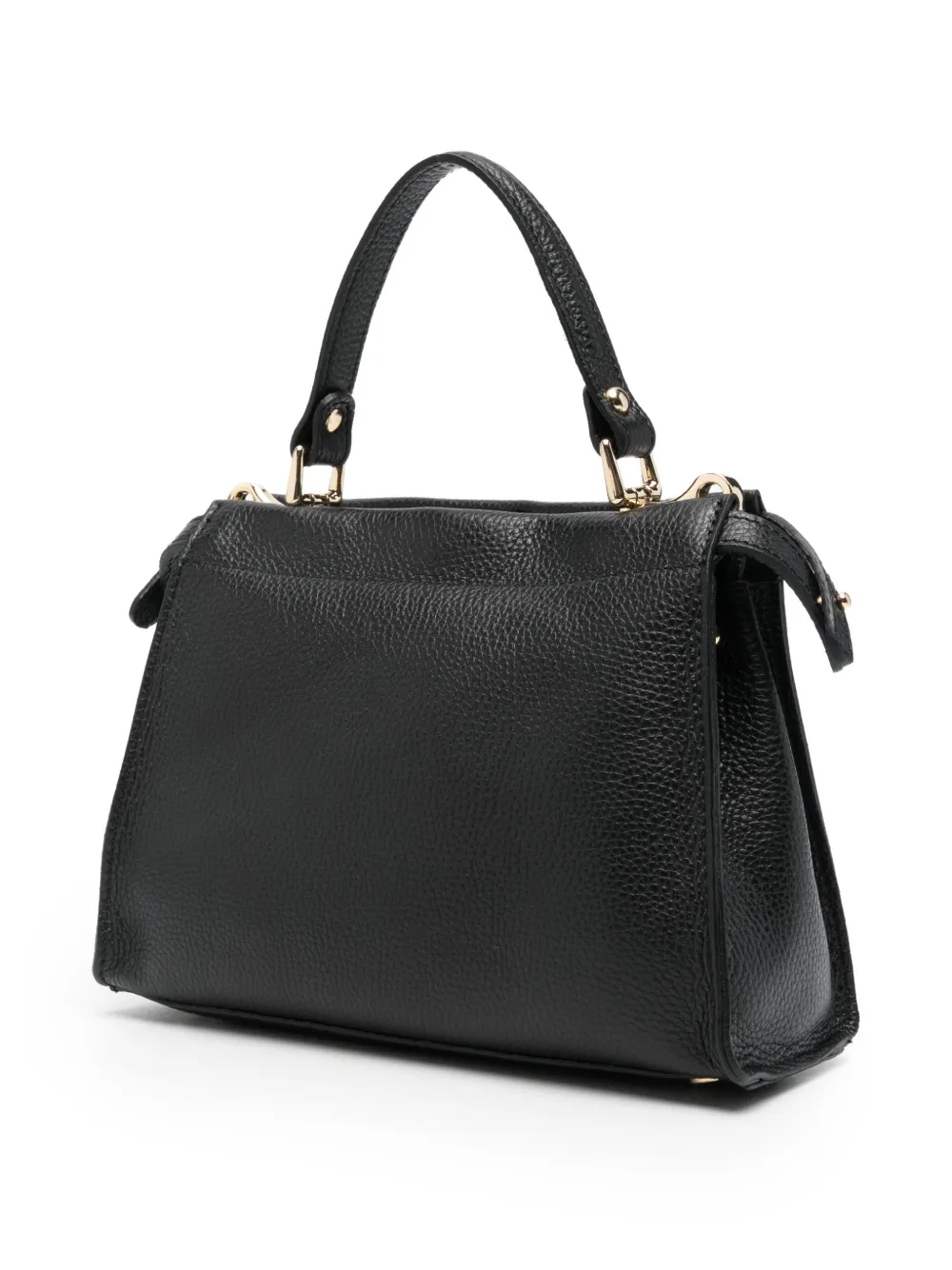 Черная сумка с верхней ручкой, съемным плечевым ремнем, фурнитурой золотистого цвета, логотипной табличкой спереди, внутренним карманом на молнии. В комплекте идет защитный чехол для хранения.