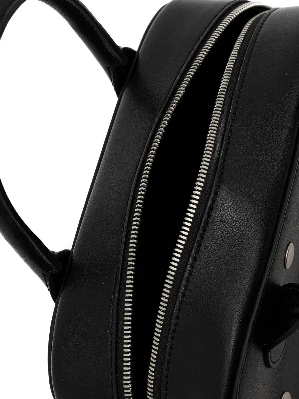 Черный верх с серебристой отделкой в виде заклепок, верхняя ручка, съемный плечевой ремень, застежка на молнии, фурнитура серебристого оттенка