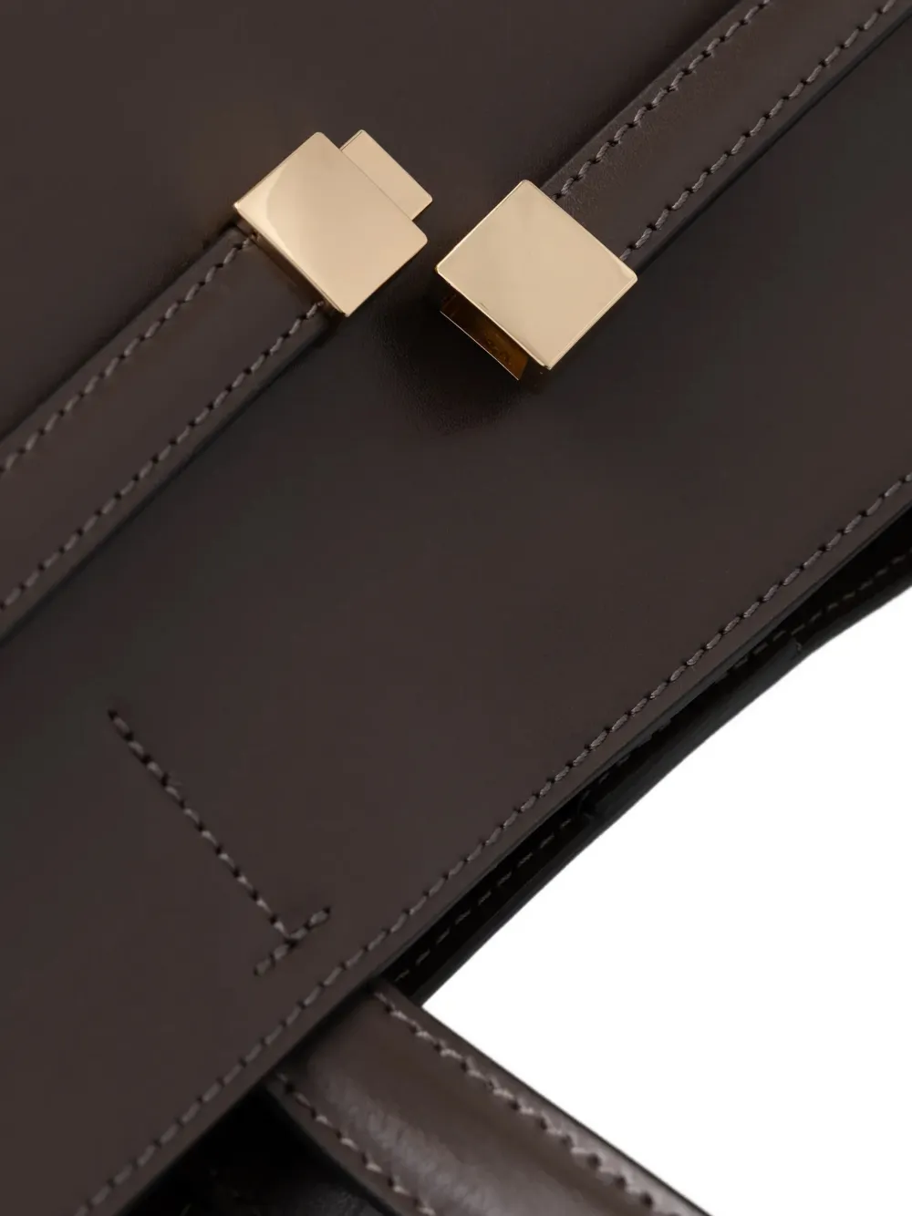 Темно-коричневая сумка с двумя верхними ручками, фурнитура золотистого цвета, внутренний карман на молнии