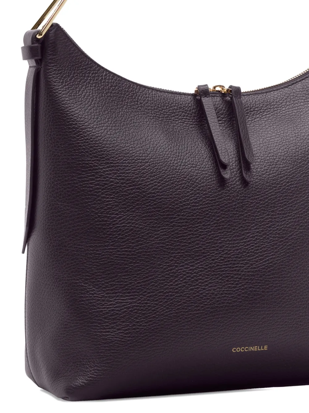 Пурпурная сумка с зернистой текстурой, верхней ручкой, съемным плечевым ремнем, фурнитурой золотистого оттенка, внутренним открытым карманом и застежкой на молнию