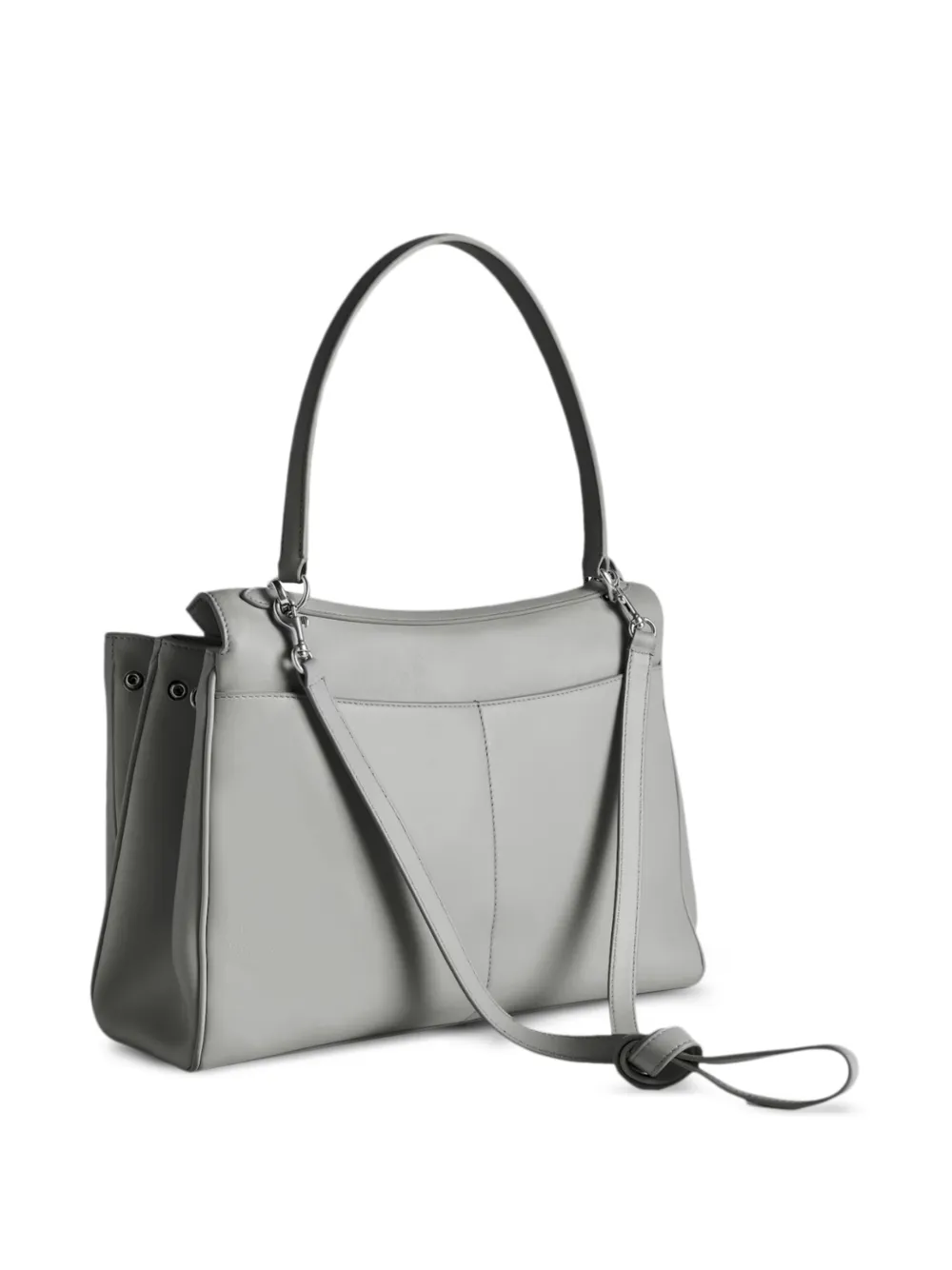 Пепельно-серая сумка с верхней ручкой, съемным плечевым ремнем, передним клапаном, гравированной фурнитурой серебристого цвета и деталями с кольцом для ключей