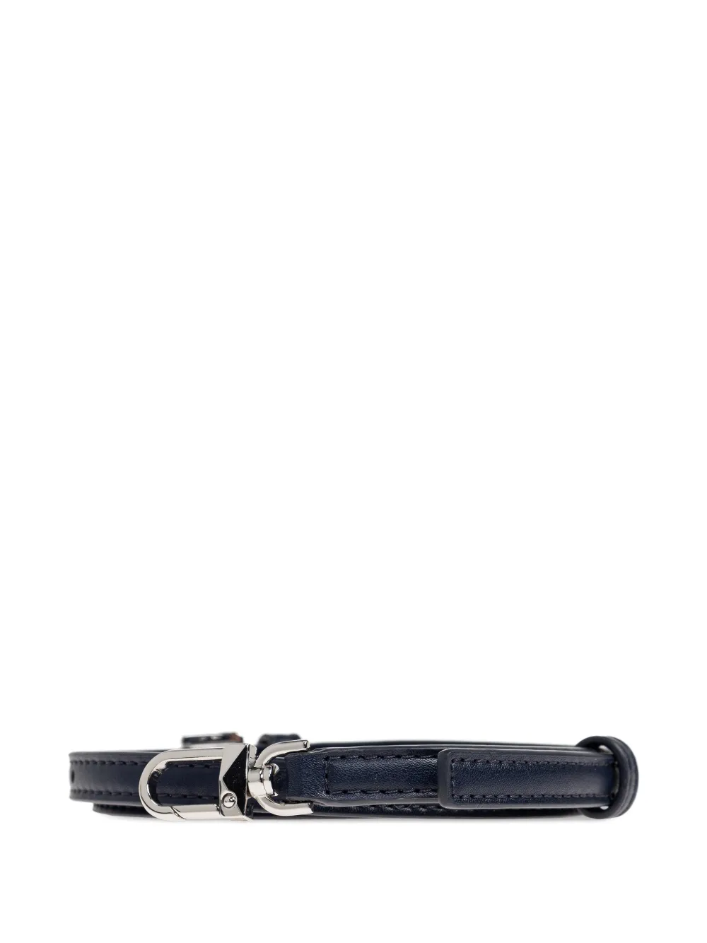 Темно-синяя сумка с монограммой, верхней ручкой, застежкой-молнией, декоративным замком и фурнитурой серебристого цвета