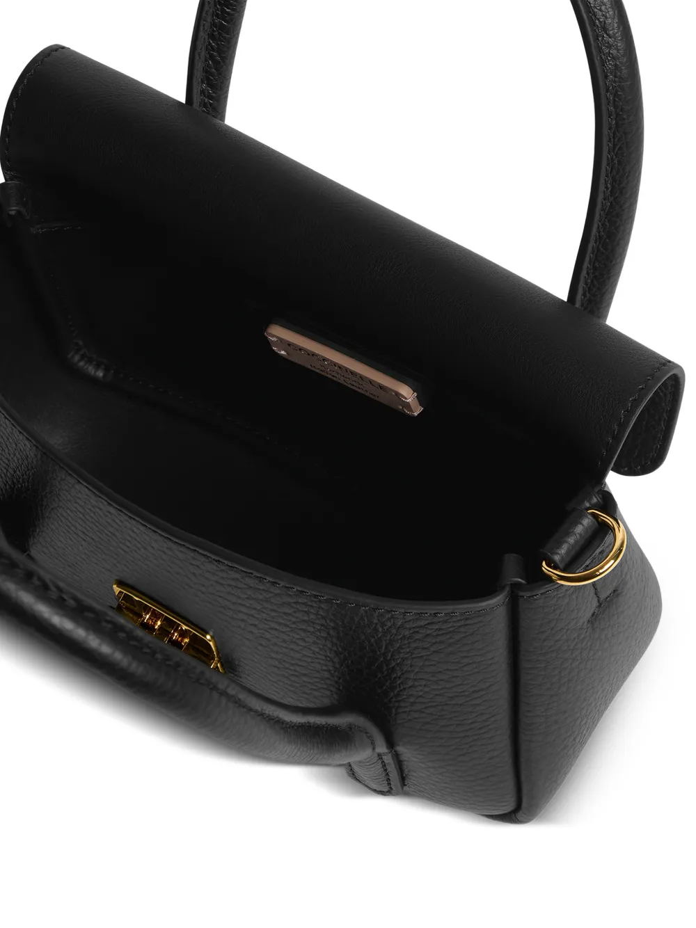 Черная сумка с верхней ручкой, фурнитурой золотистого оттенка, съемным плечевым ремнем, клапаном, логотипом