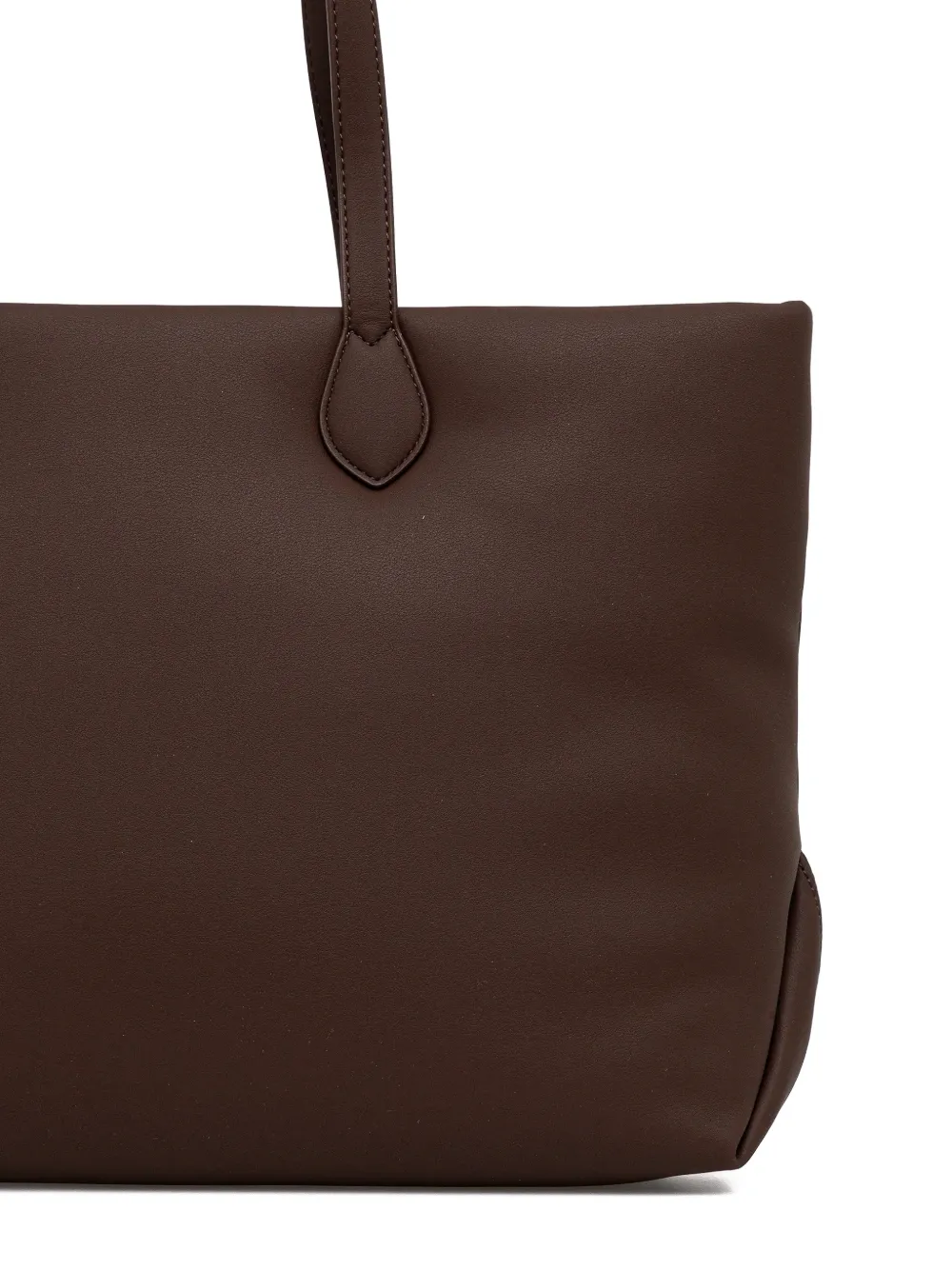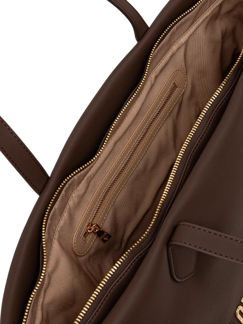 Темно-коричневая сумка с ручкой сверху, золоченой надписью-логотипом и внутренним карманом на молнии