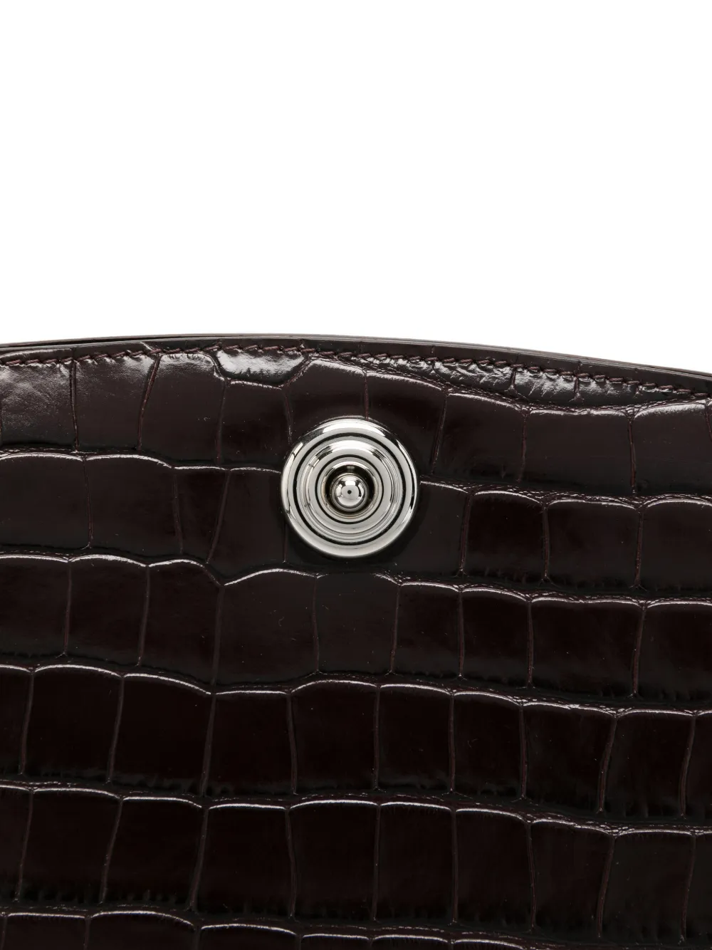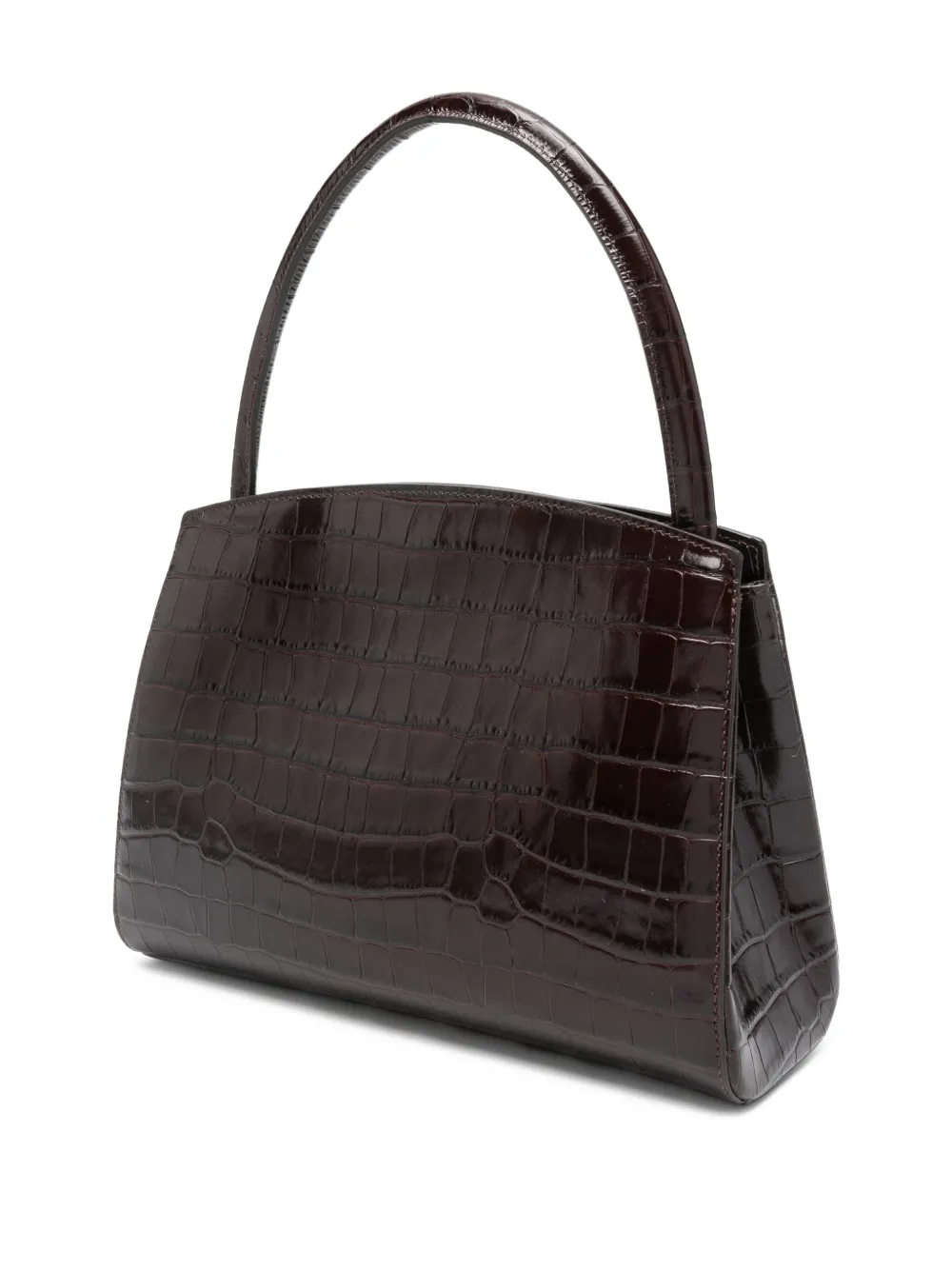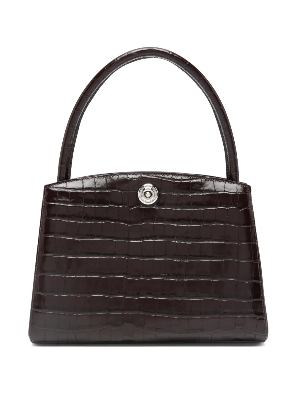 Темно-коричневая сумка с верхней ручкой, застежкой-защелкой и фурнитурой серебристого оттенка. В комплекте идет защитный мешочек для хранения.