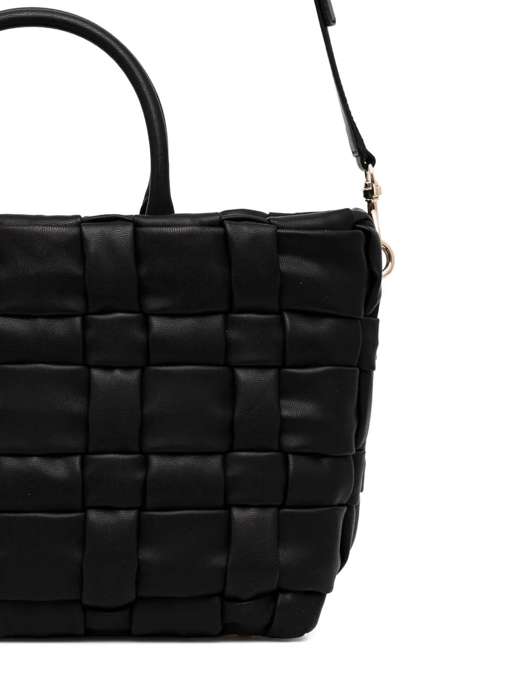 Черная сумка с верхней ручкой, съемным плечевым ремнем, декоративной подвеской с логотипом и металлическими ножками на основании