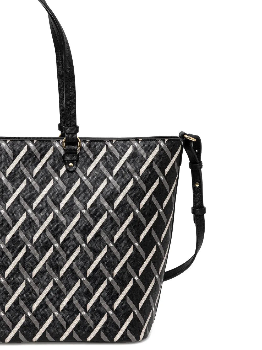 Черная сумка с графическим узором, верхними ручками, съемным плечевым ремнем, фурнитурой золотистого оттенка и брелоком с логотипом