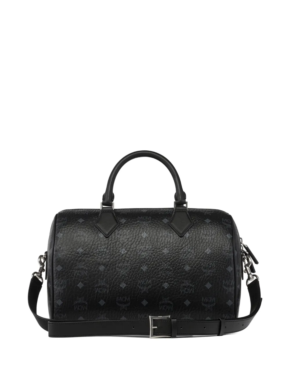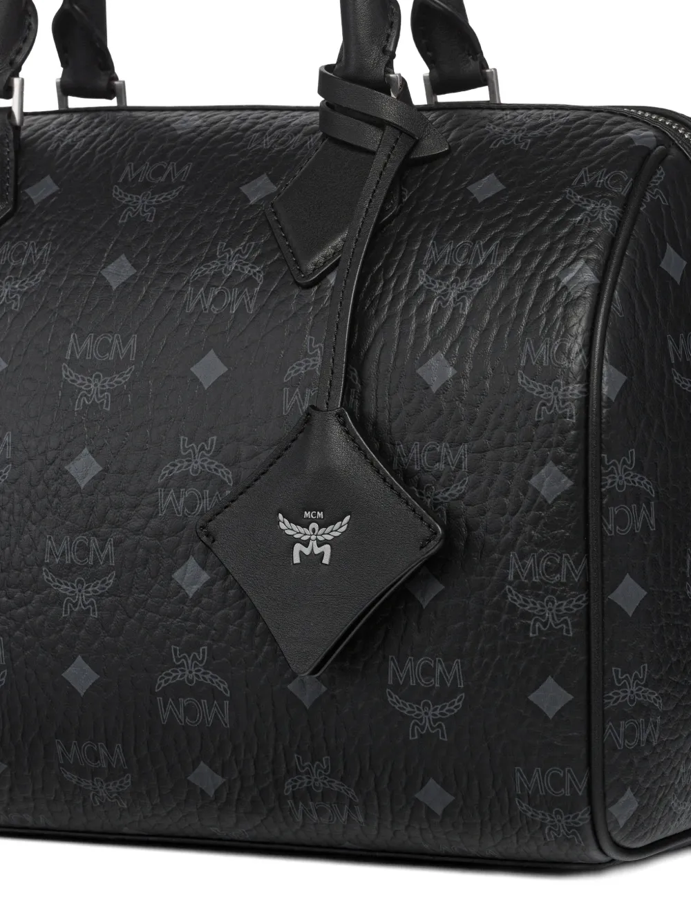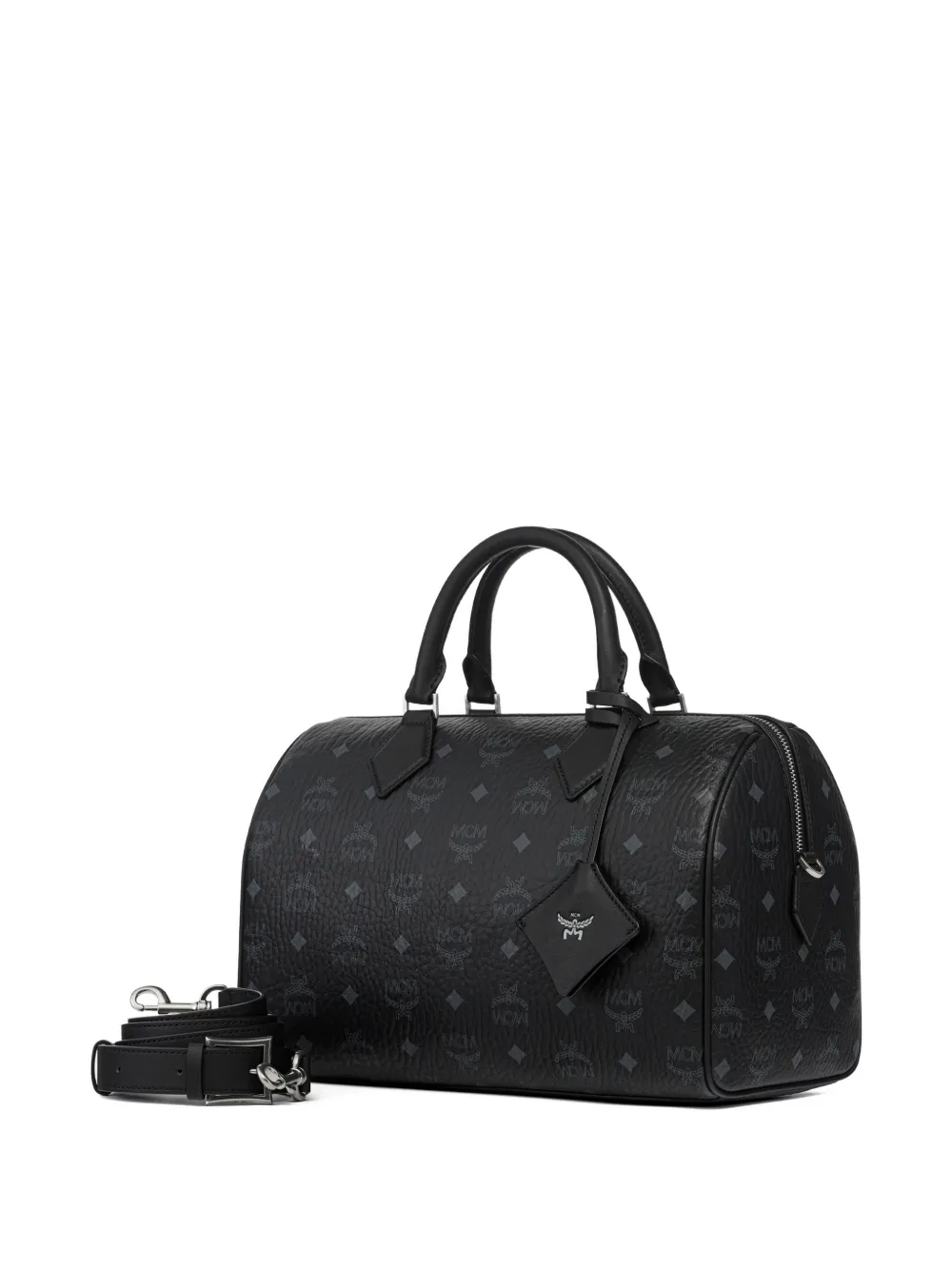 Черная сумка с принтом логотипа по всей поверхности, верхней ручкой, съемным плечевым ремнем, брелоком в форме ромба и фурнитурой серебристого цвета