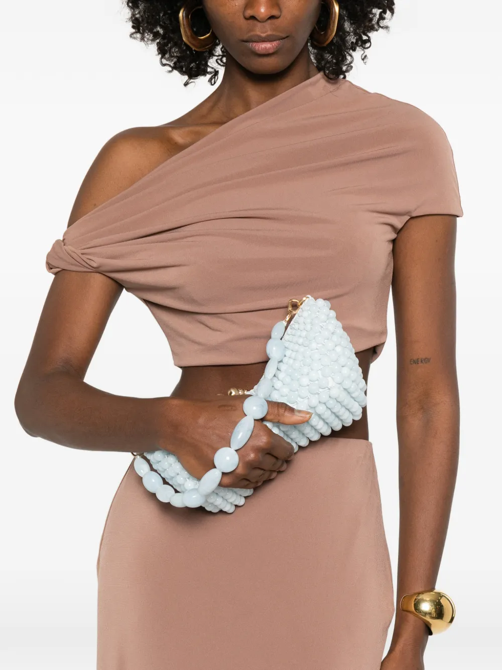 Светло-голубой, украшен бусинами, фурнитура золотистого оттенка, верхняя ручка, застежка на молнии. Этот аксессуар поставляется с защитным мешочком.