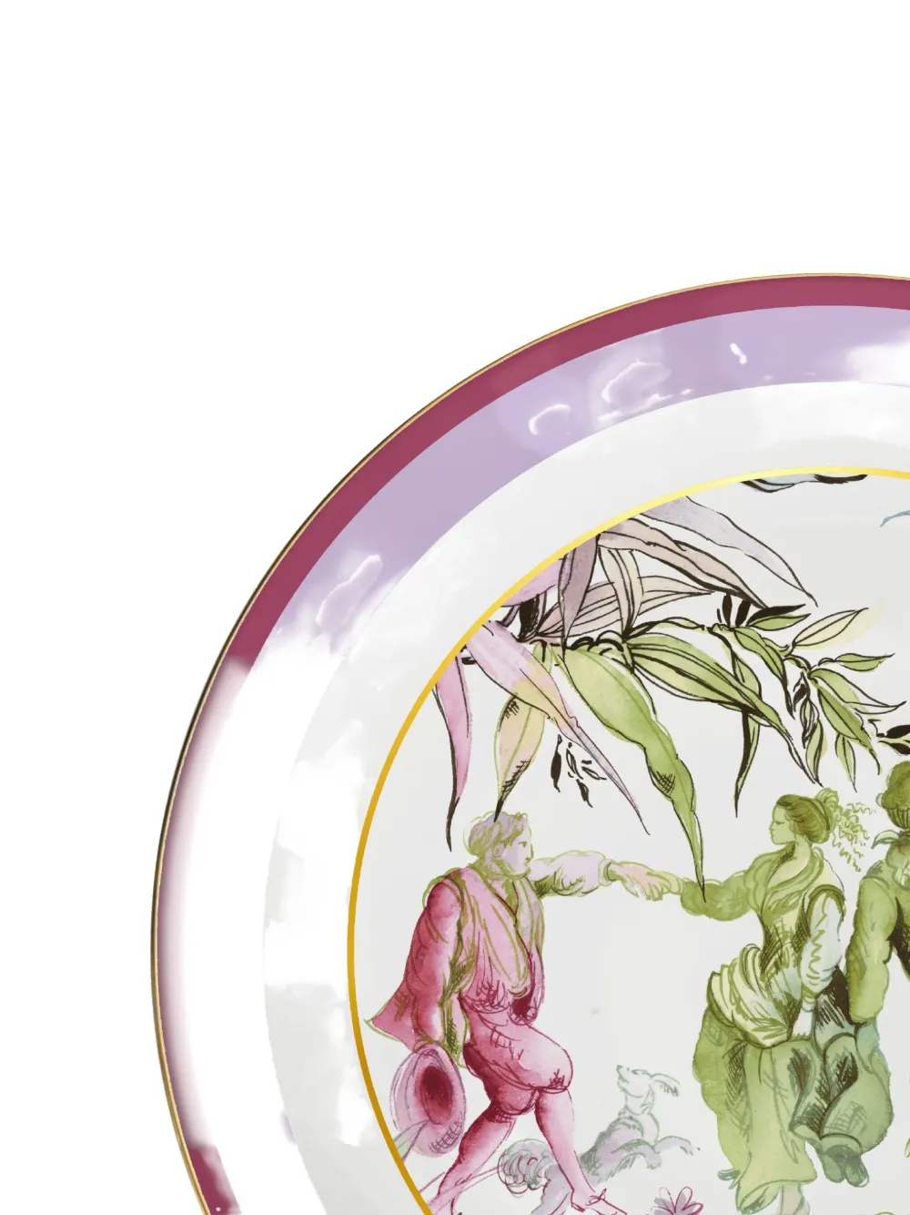Многоцветный, золотая отделка, фиолетовая полоса, розовая полоса, пасторальная сцена, танцующие люди