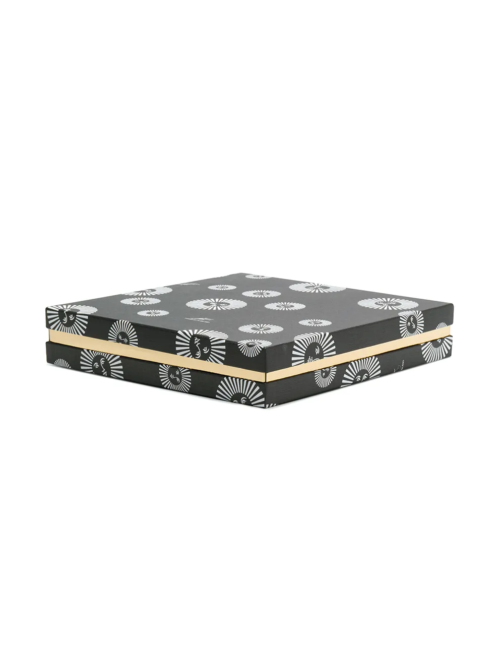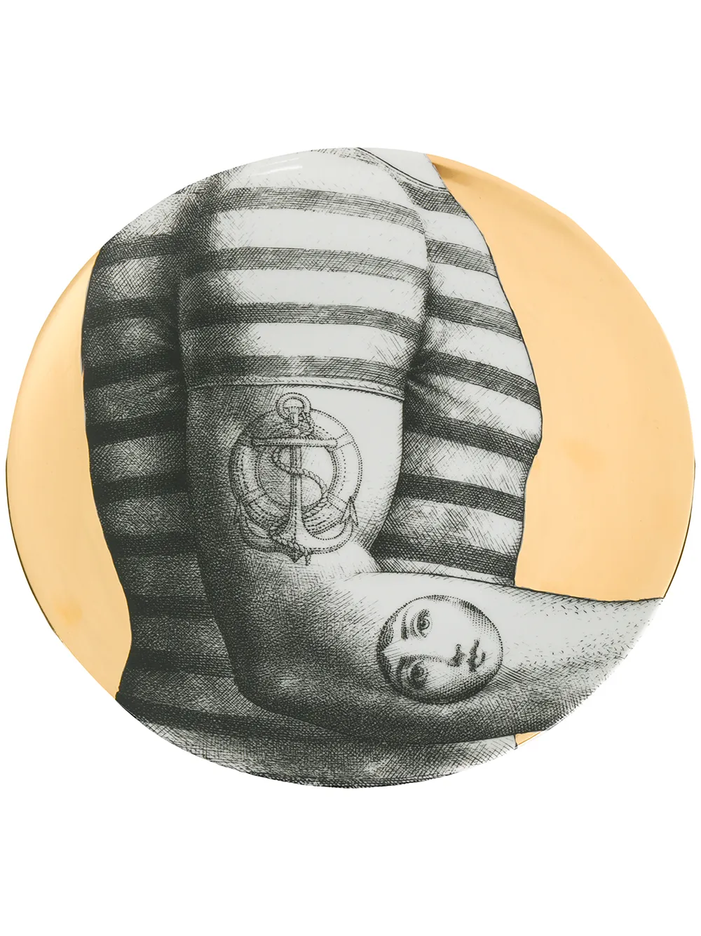 Черная с белым и золотистым керамическая тарелка с принтом от Fornasetti.