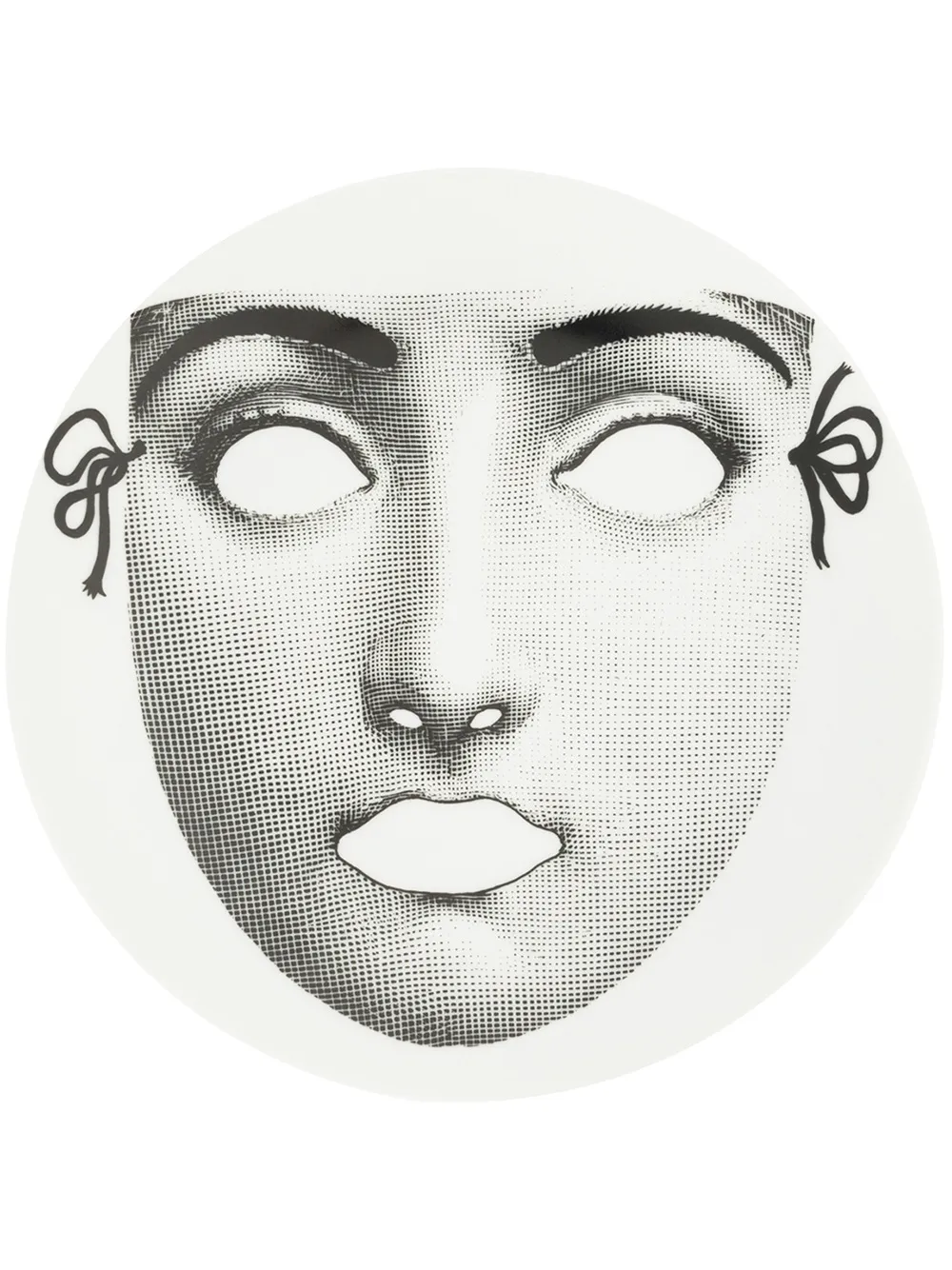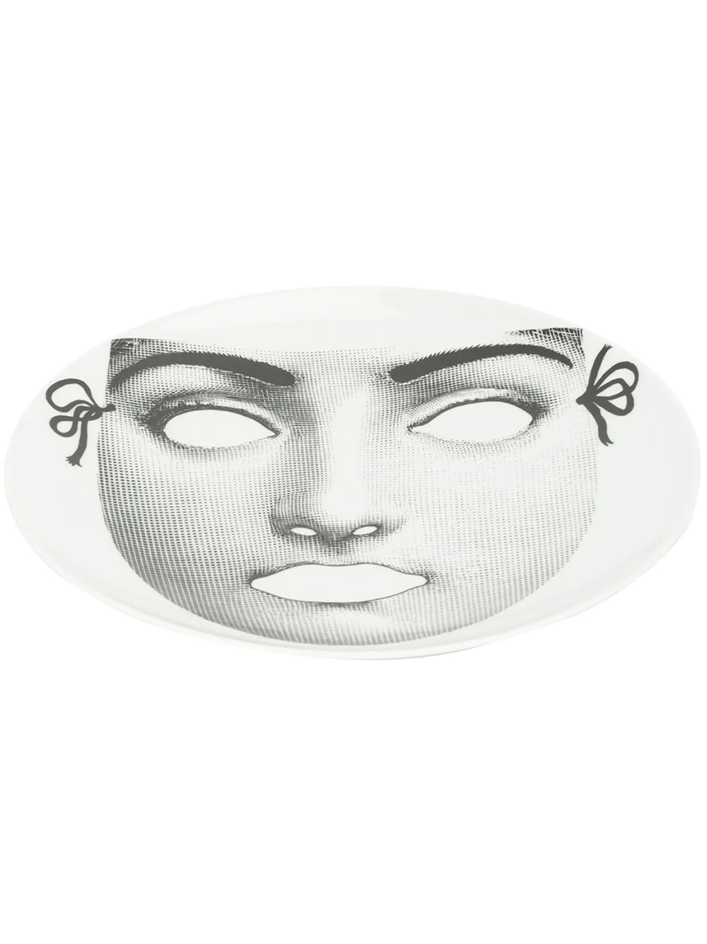 Черная с белым керамическая тарелка с принтом маски от Fornasetti.