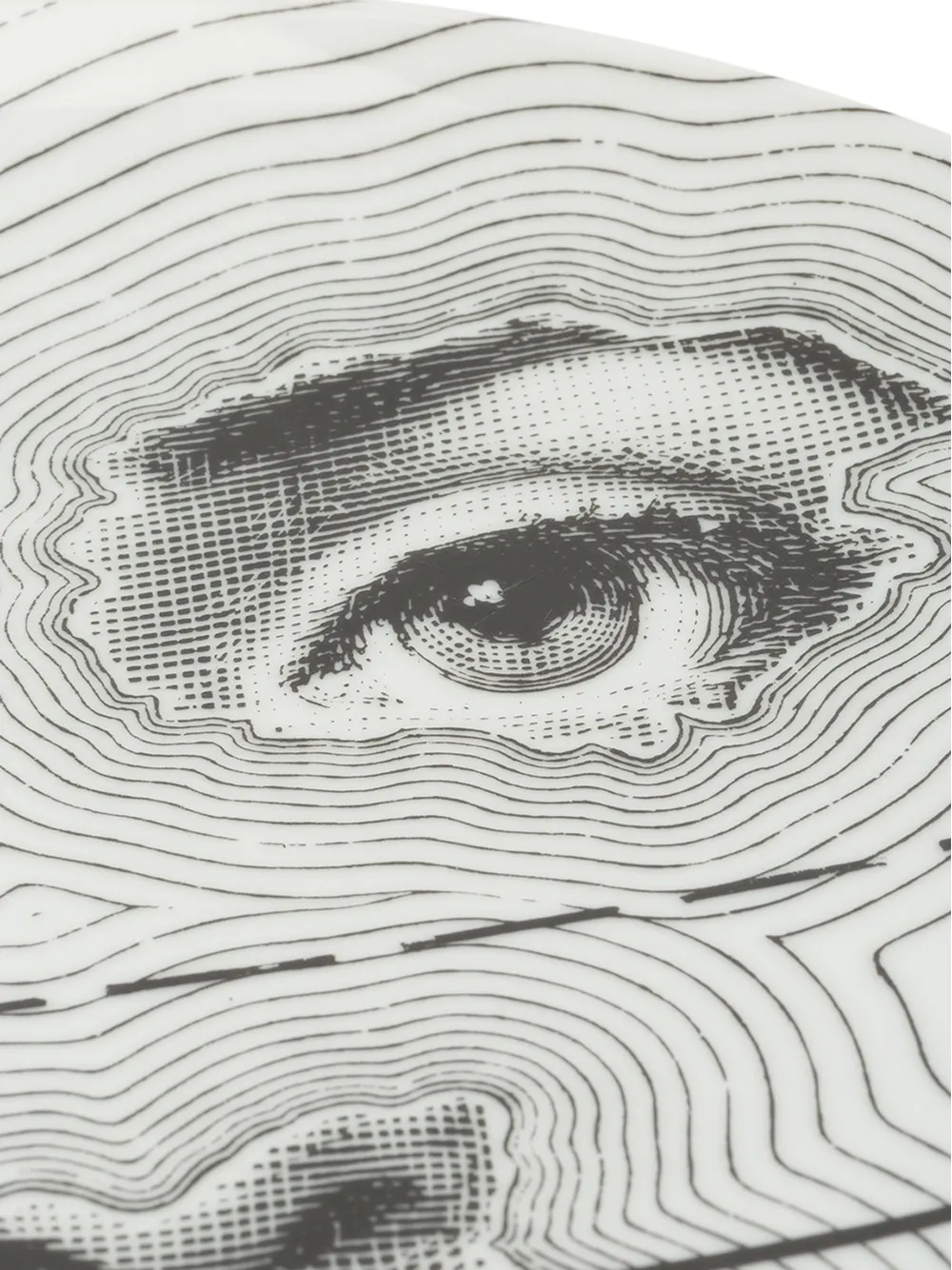 Черная с белым керамическая тарелка с принтом лица от Fornasetti.