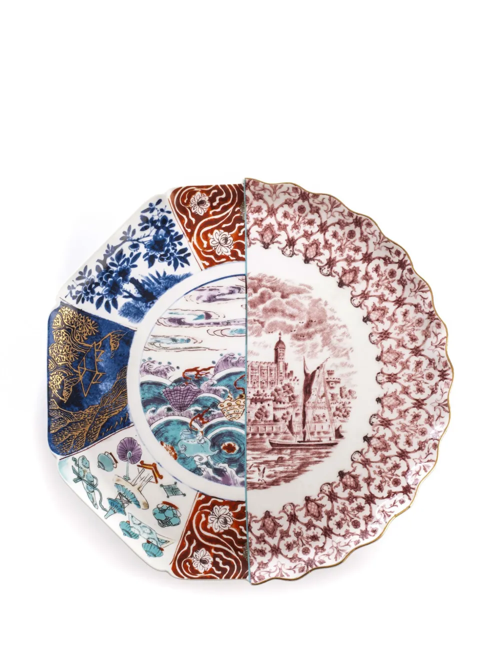Белый/разноцветный, фарфор, смешанный принт, асимметричная форма, края с фестонами и скругленные углы.