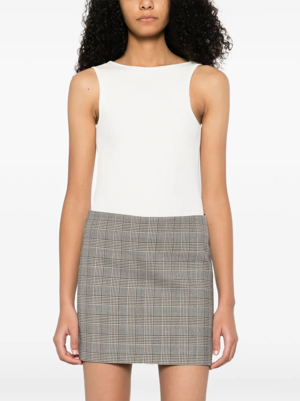 Белый комбинезон без рукавов с американской проймой, с круглым вырезом, высоким вырезом бедра, из эластичной ткани. Напоминаем, что этот предмет необходимо примерять поверх собственного нижнего белья.