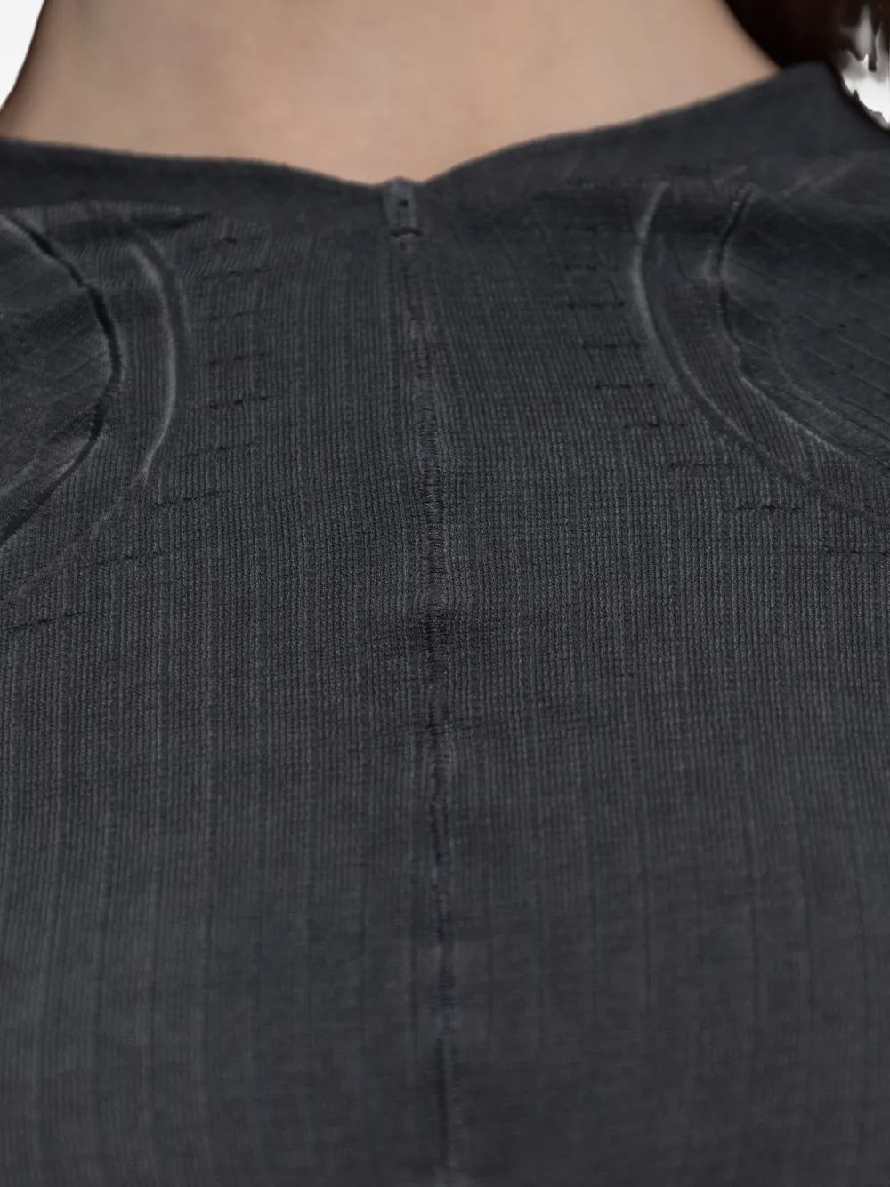 Черный с ребристой текстурой, круглый вырез, длинные рукава, вырезы спереди и на плечах