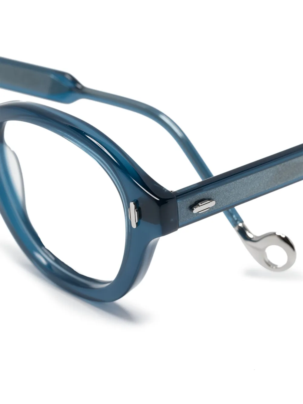 Синий, прозрачная оправа, прозрачные линзы, круглая оправа, серебристая фурнитура, прямые дужки и дужки с закругленными концами. Обратите внимание, что на FARFETCH продаются оправы с линзами без диоптрий. В комплект входит защитный чехол для очков.