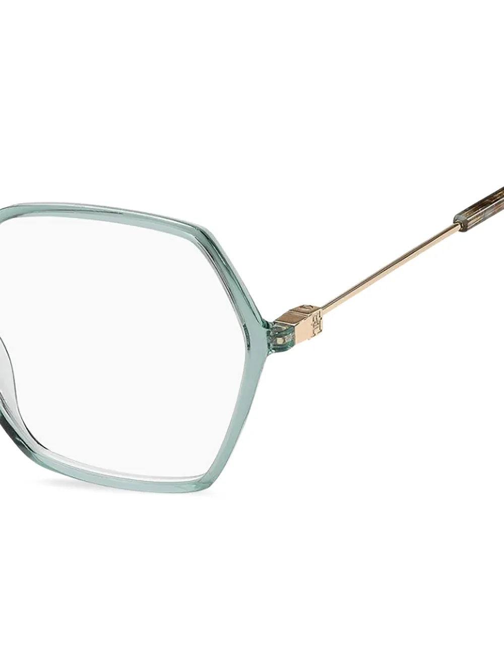 Зеленая геометрическая оправа, заушники с узором, носовые упоры. Эти очки поставляются в защитном футляре. Все очки на FARFETCH продаются как оправа без корректирующих линз.