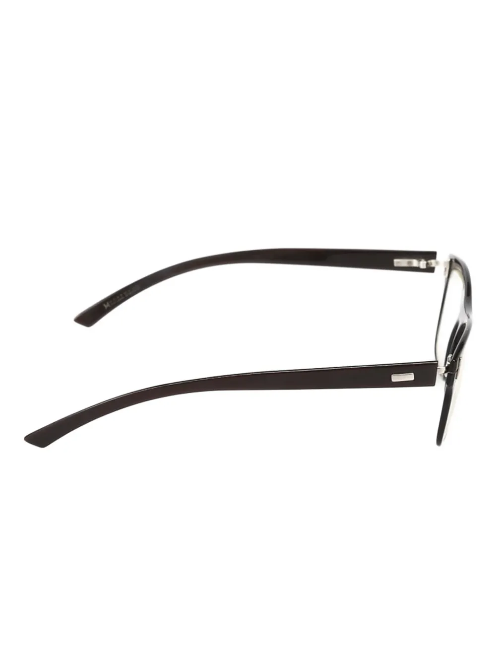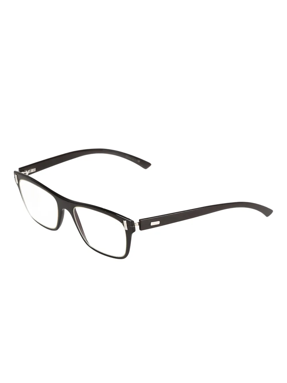 Черная прямоугольная оправа, тонкие дужки, серебристые элементы, прямая переносица, имитация рога. В комплекте защитный футляр. Все очки на FARFETCH продаются как оправа без диоптрий.