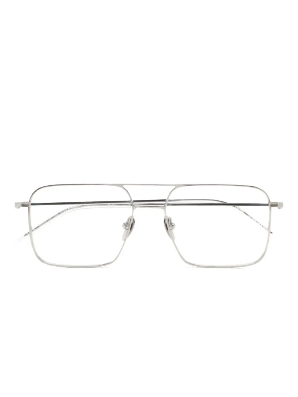 Серебристая прямоугольная оправа, двойная перемычка, носовые упоры. Очки поставляются в защитном футляре. Все очки на FARFETCH продаются без корректирующих линз.