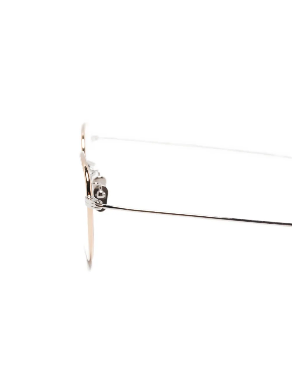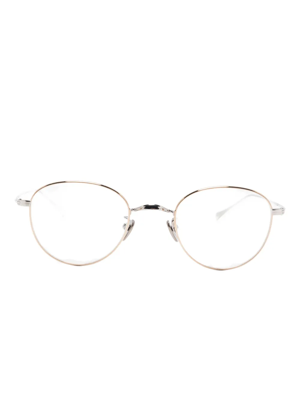 Серебряная и золотая круглая оправа, титановая переносица, тонкие дужки. Все очки на FARFETCH продаются без диоптрий. Очки поставляются с защитным футляром.