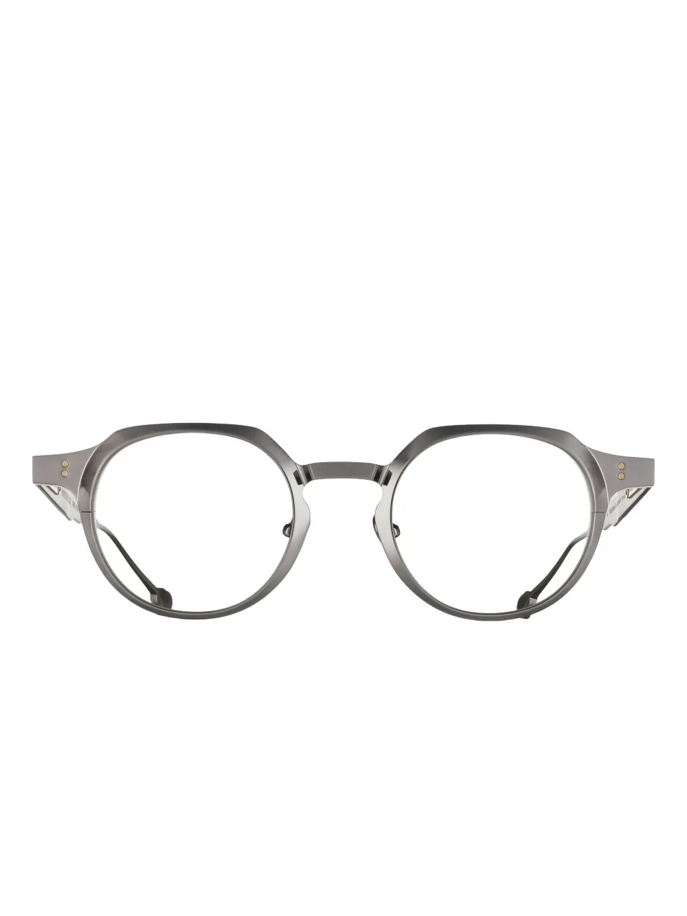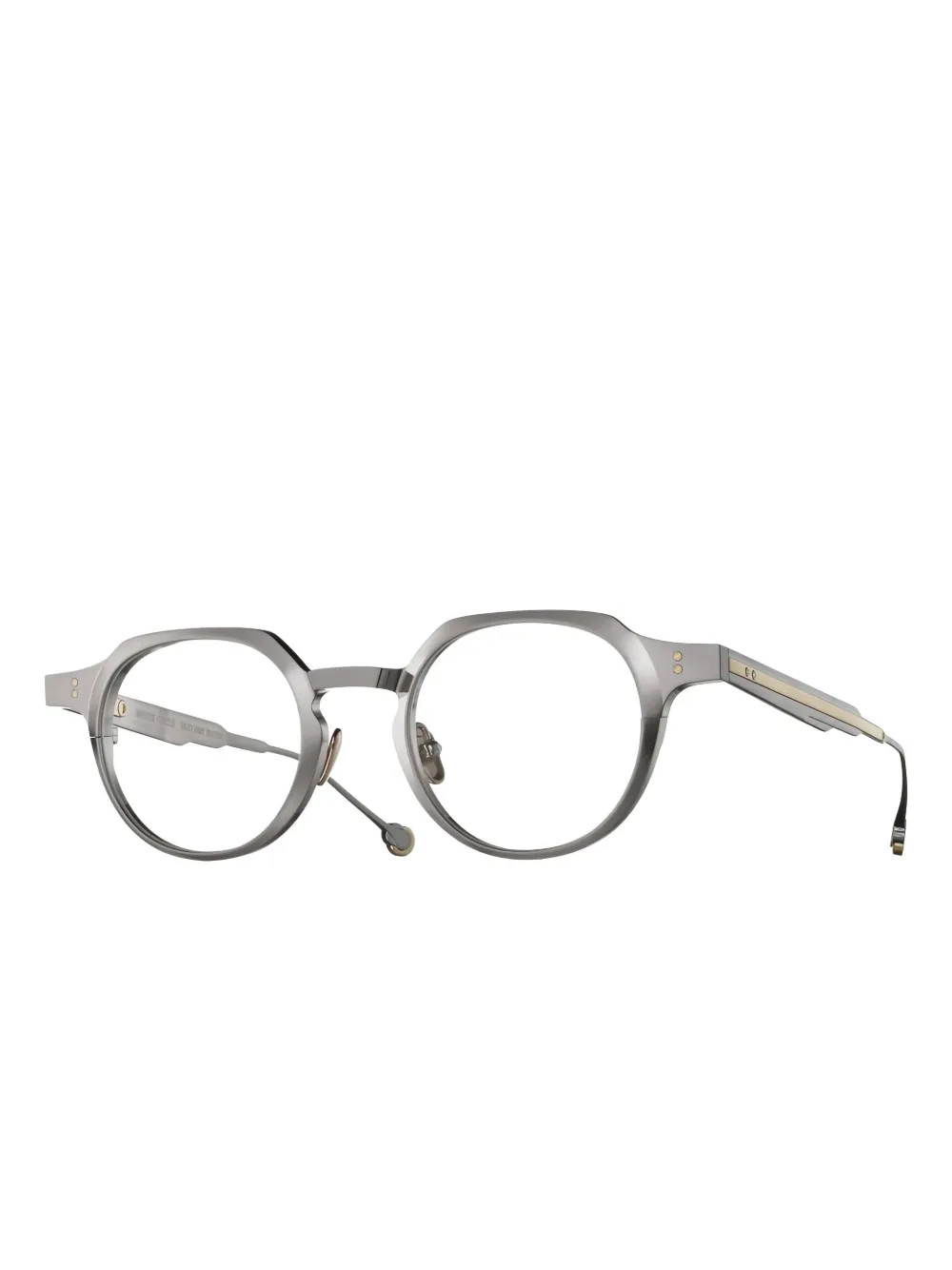 Серый цвет геометрическая оправа декор в золотистых тонах прозрачные линзы носовые упоры пружинные петли В комплекте с этими очками идет защитный футляр. Все очки FARFETCH продаются как оправа без диоптрий.