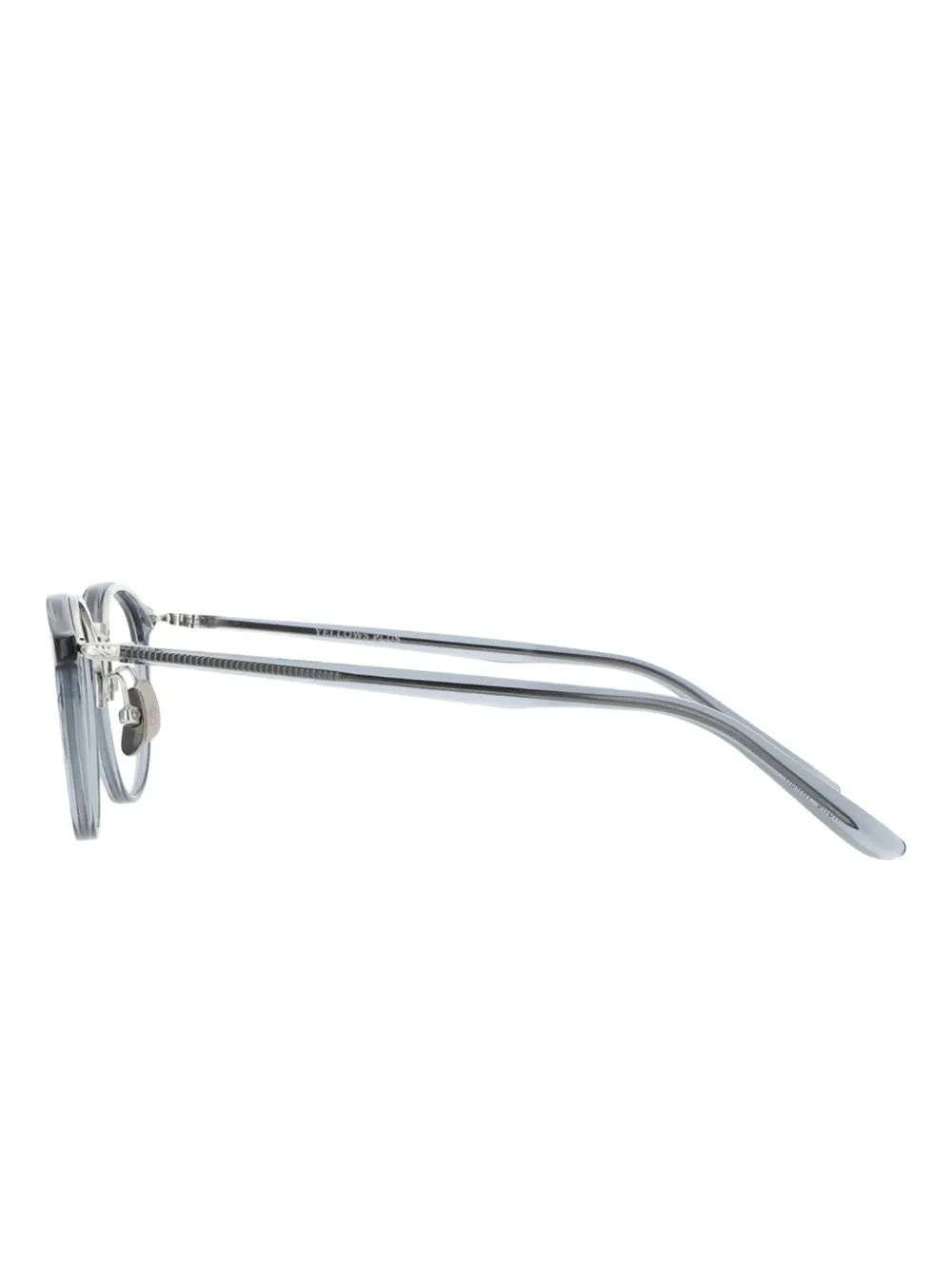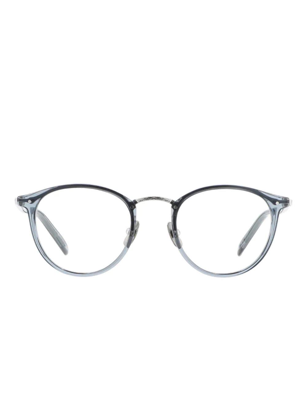 Синие круглые оправы, носовые упоры, серебристая деталь, прямые заушники