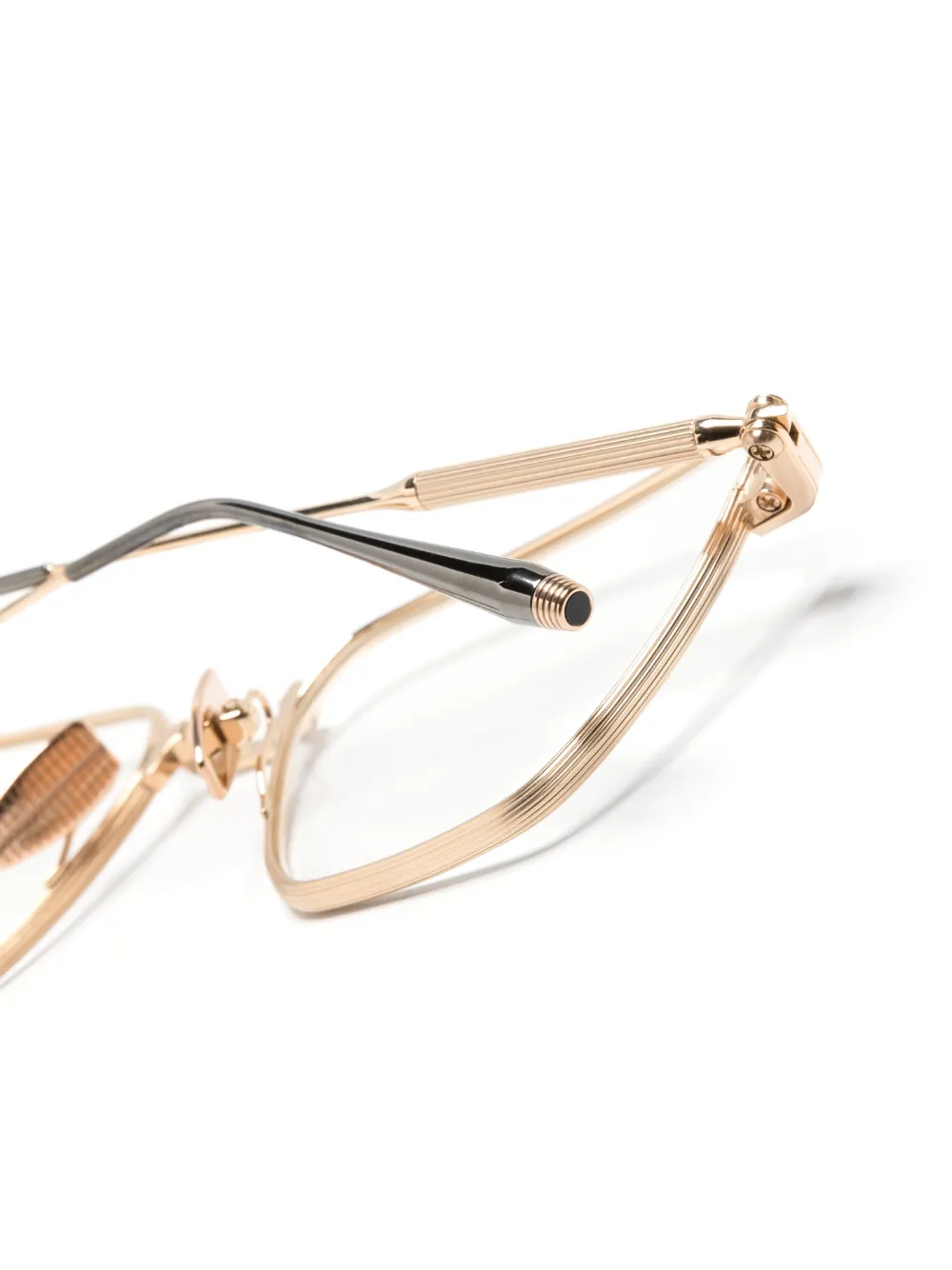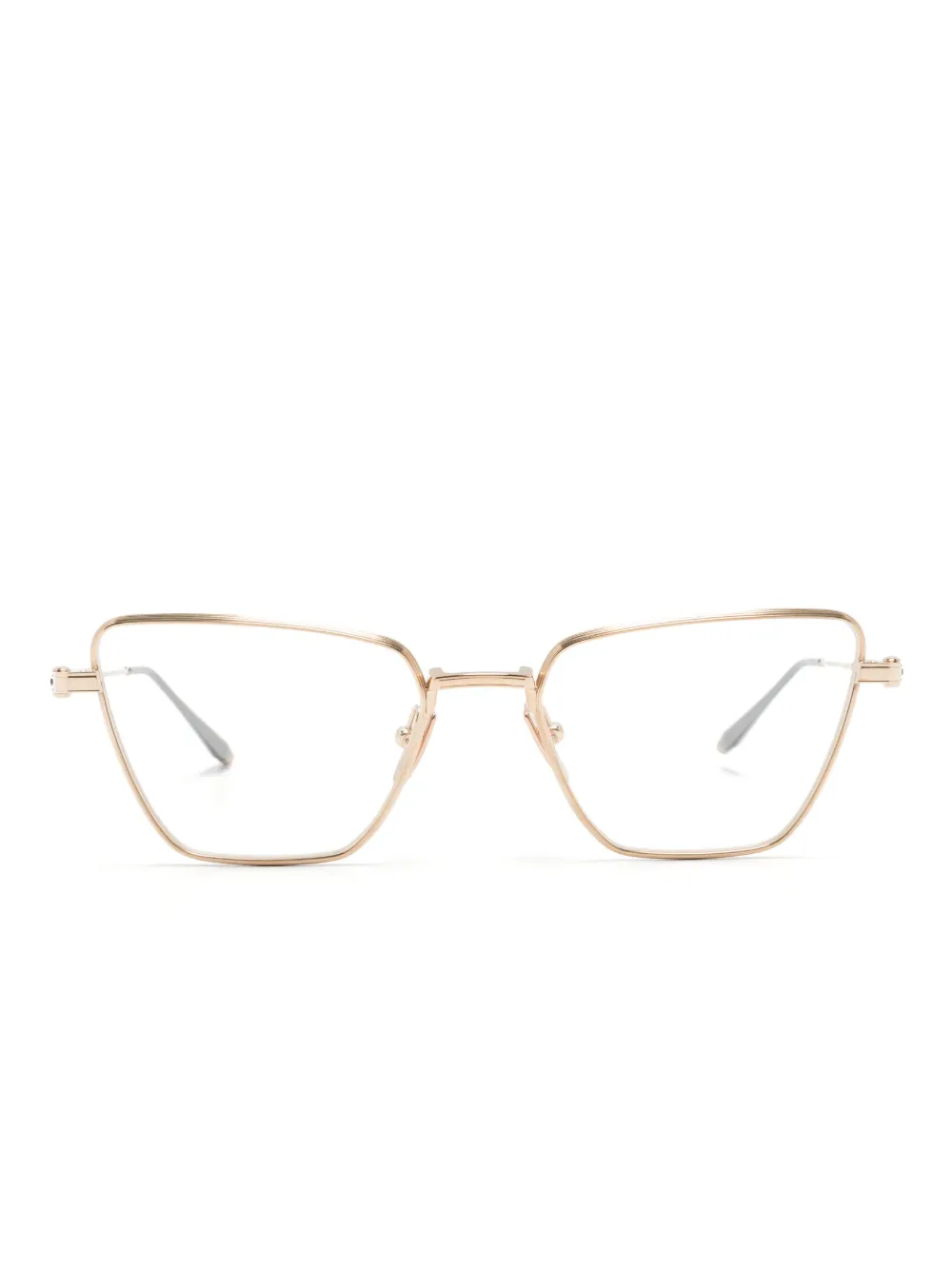 Золотистый, титан, оправа «кошачий глаз», прозрачные линзы, носоупоры, прямые дужки и дужки с закругленными концами. В комплект входит защитный чехол для очков. Обратите внимание, что на FARFETCH продаются оправы с линзами без диоптрий.