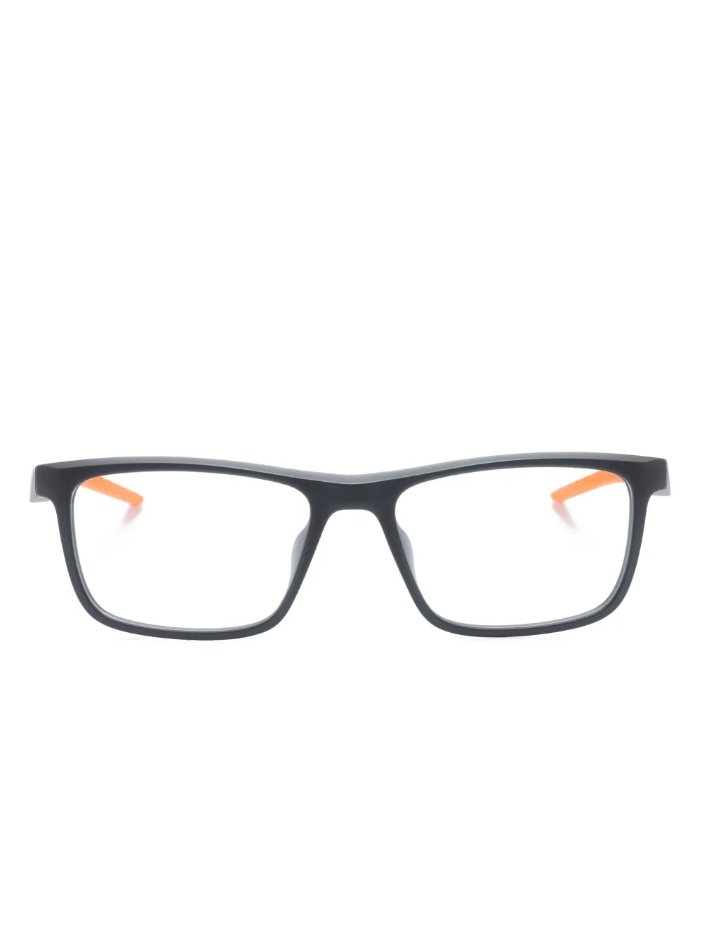 Синий, ацетат, прямоугольная оправа, прозрачные линзы, сочетание двух оттенков, прямые дужки, прямые наконечники дужек и логотип Nike Swoosh. В комплект входит защитный чехол для очков. Обратите внимание, что на FARFETCH продаются оправы с линзами без диоптрий.
