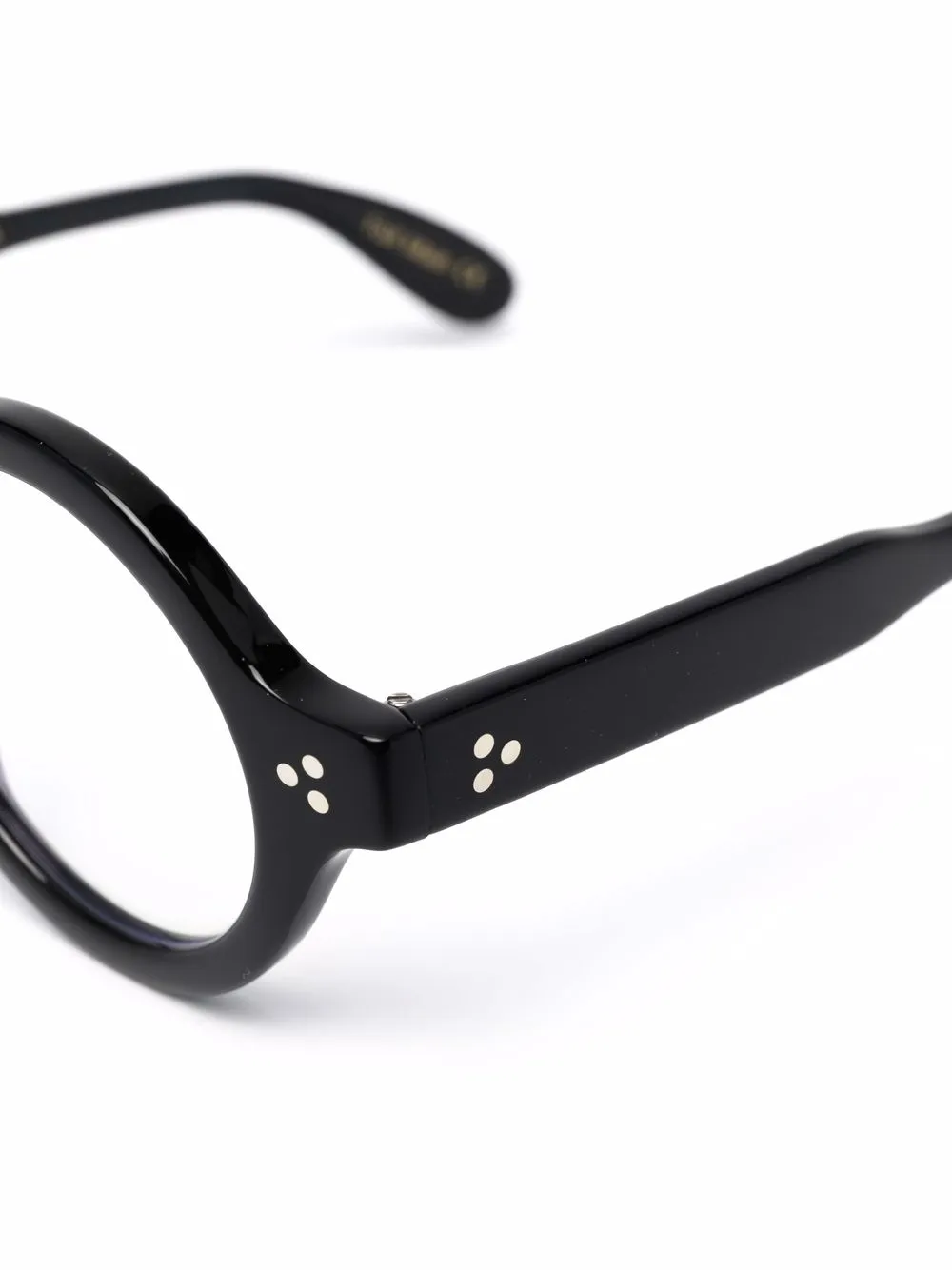 Серебристые заклепки, круглая оправа, прямые дужки и дужки с закругленными концами. Цвет: черный. В комплект входит защитный чехол для очков. Обратите внимание, что на FARFETCH продаются оправы с линзами без диоптрий.