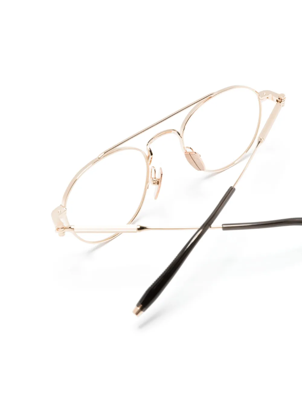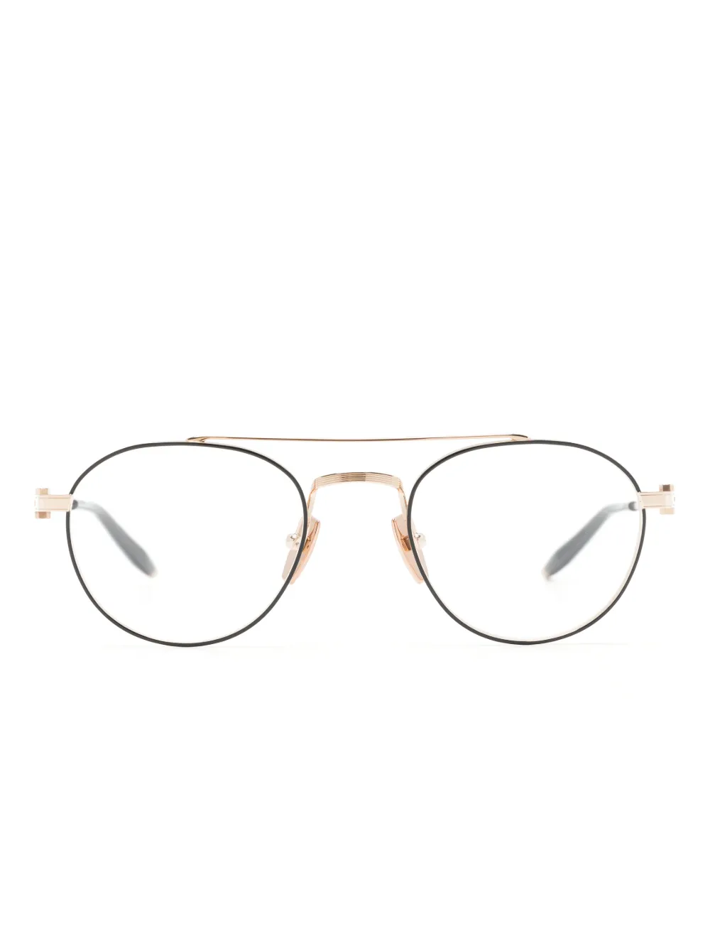 Золотистый, черный, металл, круглая оправа, прозрачные линзы, двойной мост, носоупоры, прямые дужки и дужки с закругленными концами. Обратите внимание, что на FARFETCH продаются оправы с линзами без диоптрий. В комплект входит защитный чехол для очков.