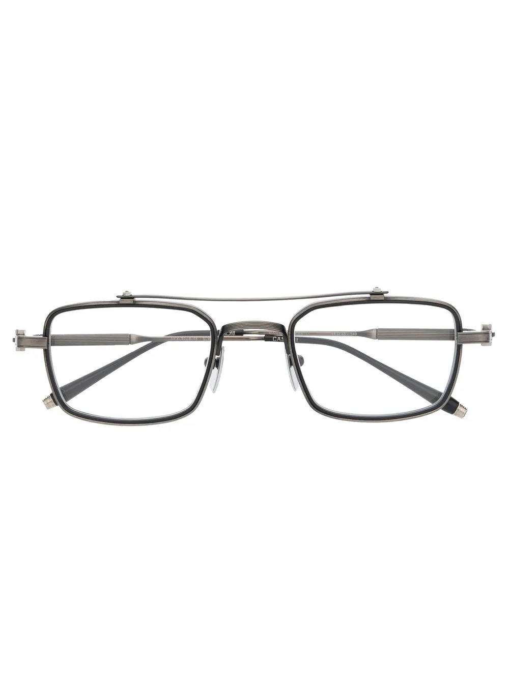 Серебристый, титан, прозрачные линзы, прямоугольная оправа, прямые дужки и дужки с закругленными концами. Обратите внимание, что на FARFETCH продаются оправы с линзами без диоптрий.