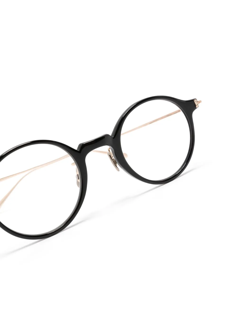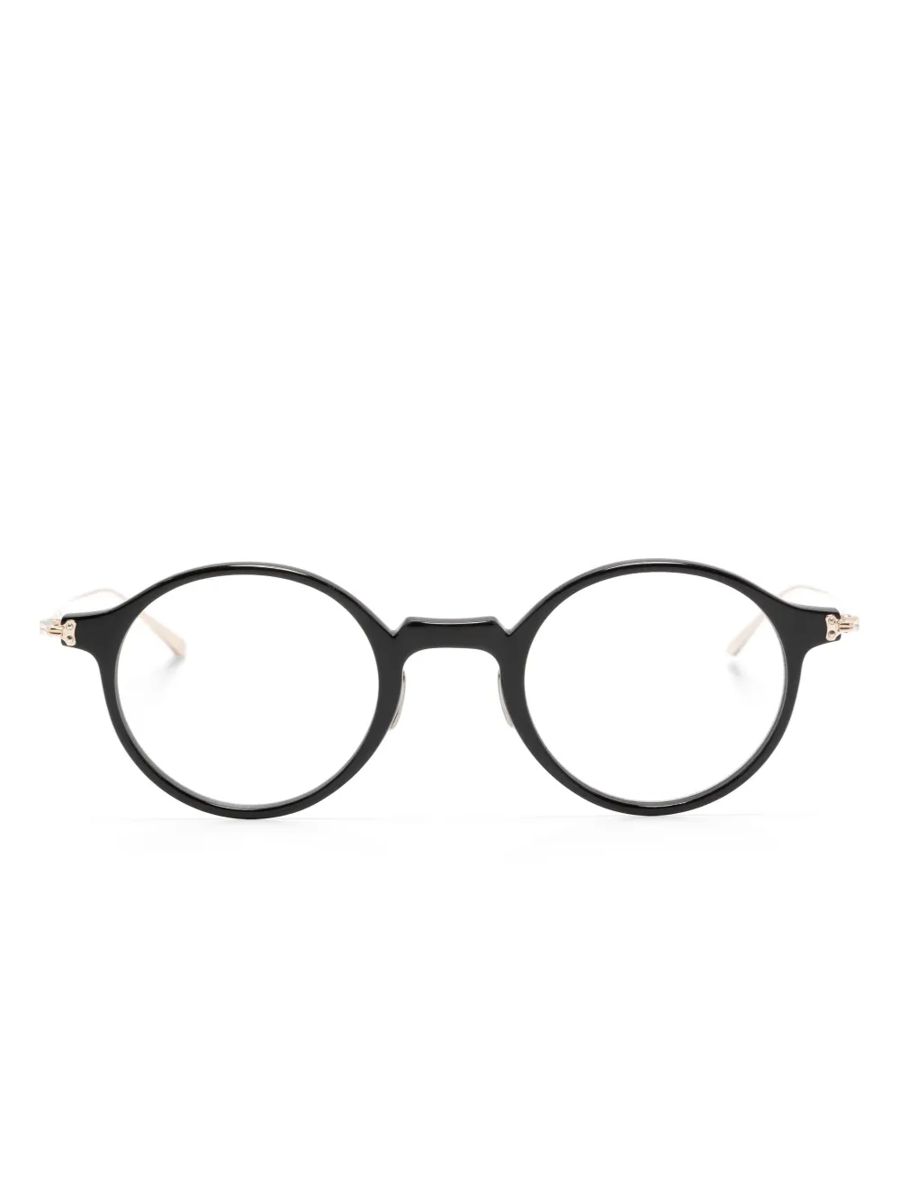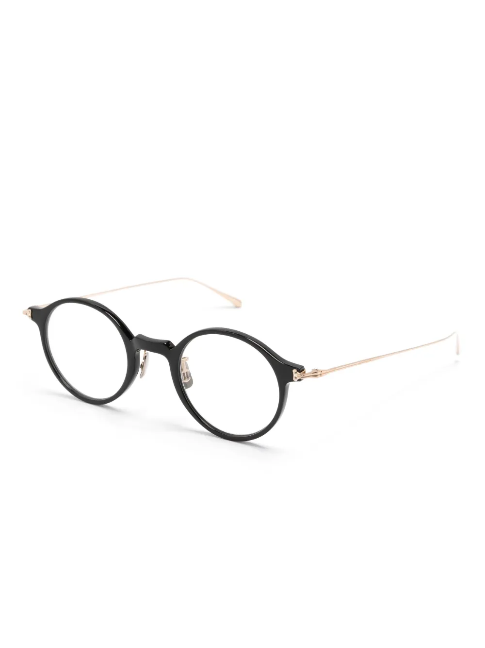 Черный, круглая оправа, прозрачные линзы, прямые дужки и дужки с закругленными концами. Обратите внимание, что на FARFETCH продаются оправы с линзами без диоптрий. В комплект входит защитный чехол для очков.