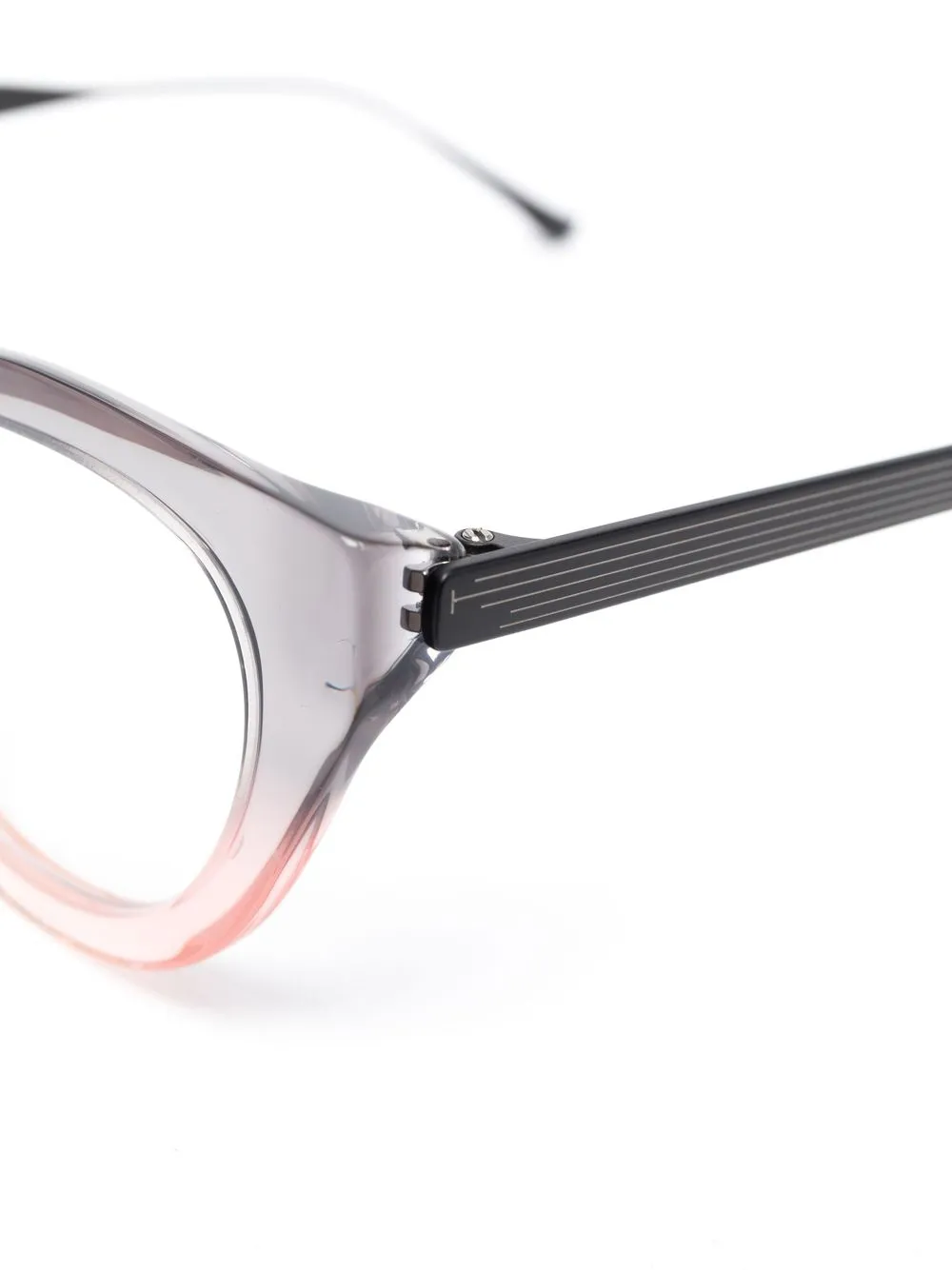 Серый, светло-розовый, градиентный эффект, квадратная оправа и прозрачные линзы. Обратите внимание, что на FARFETCH продаются оправы с линзами без диоптрий. В комплект входит защитный чехол для очков.
