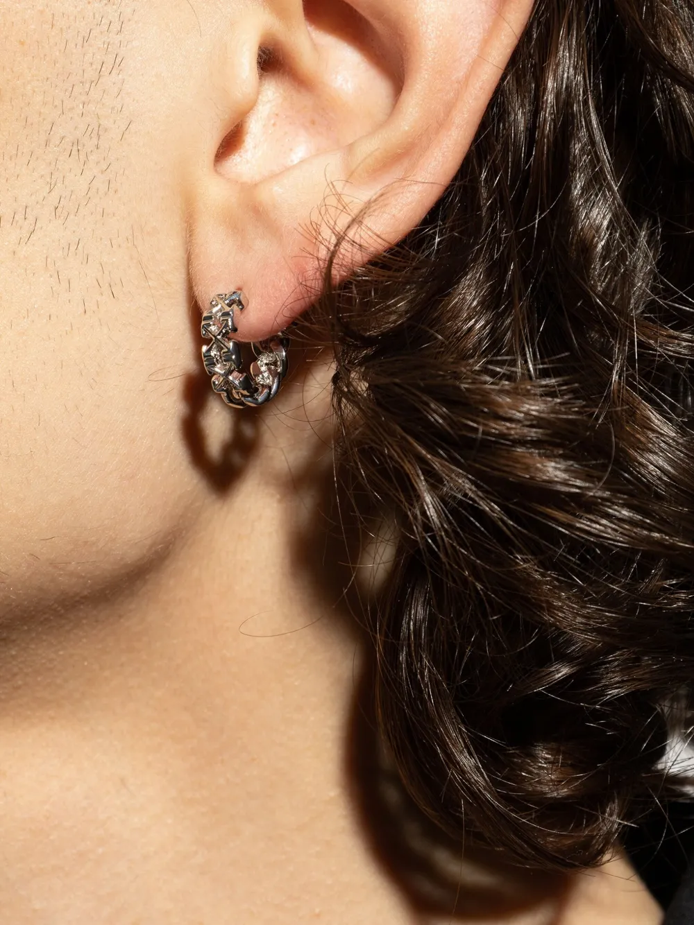 Серебристый оттенок фирменный мотив "Стрелы" дизайн в виде кольца застежка на петле Это одна серьга.