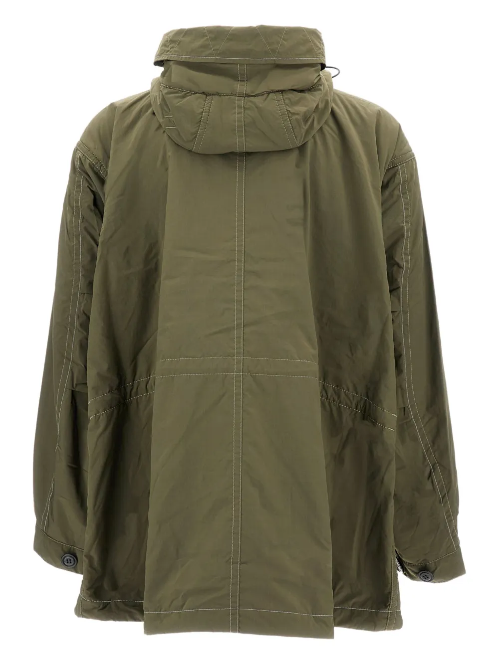 Зеленый цвет, регулируемый капюшон, светоотражающие элементы, нагрудные карманы на молнии, прорезные карманы с клапанами для рук, подол типа "рыбий хвост"