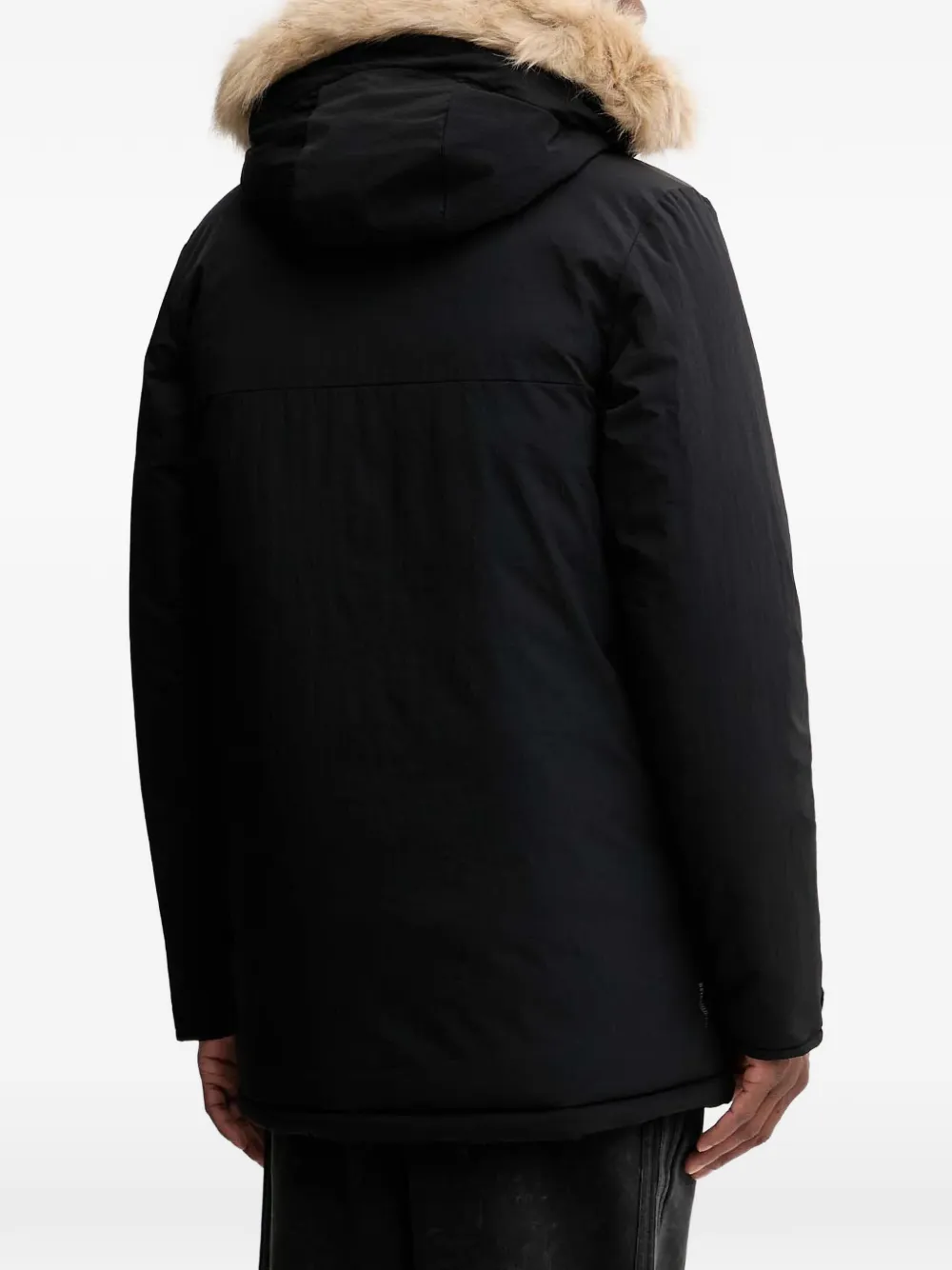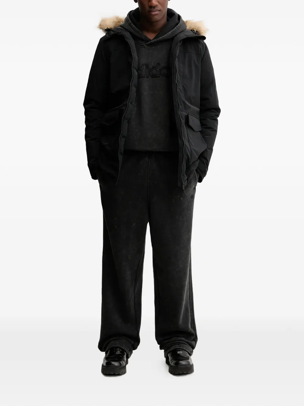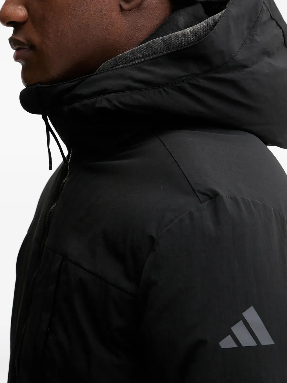 Черная куртка с застежкой-молнией, капюшоном, длинными рукавами и передними накладными карманами