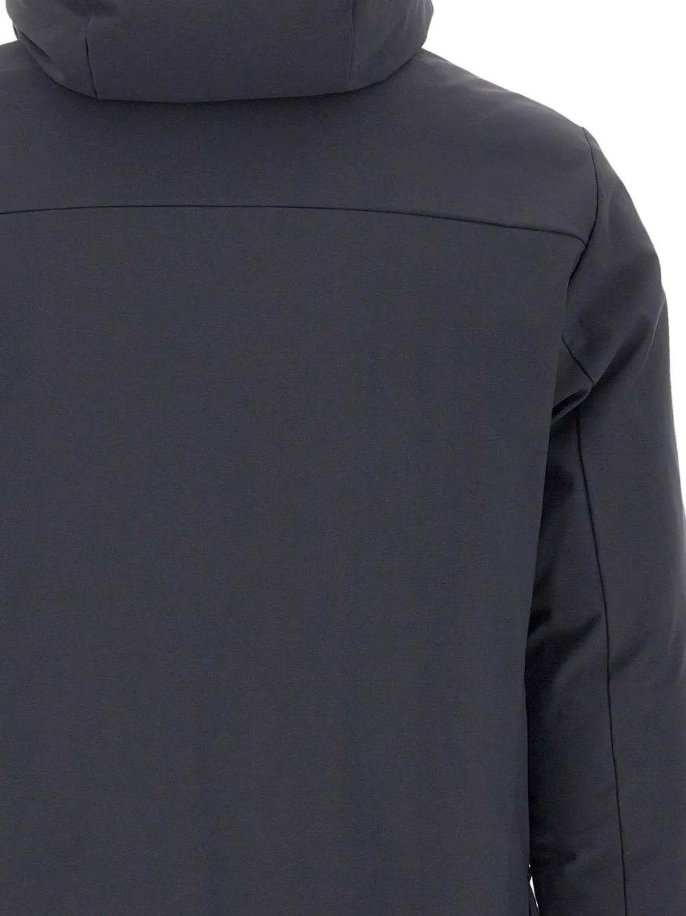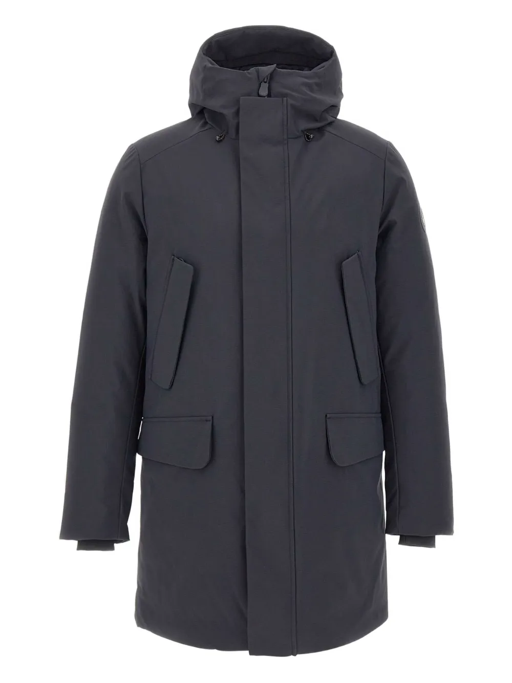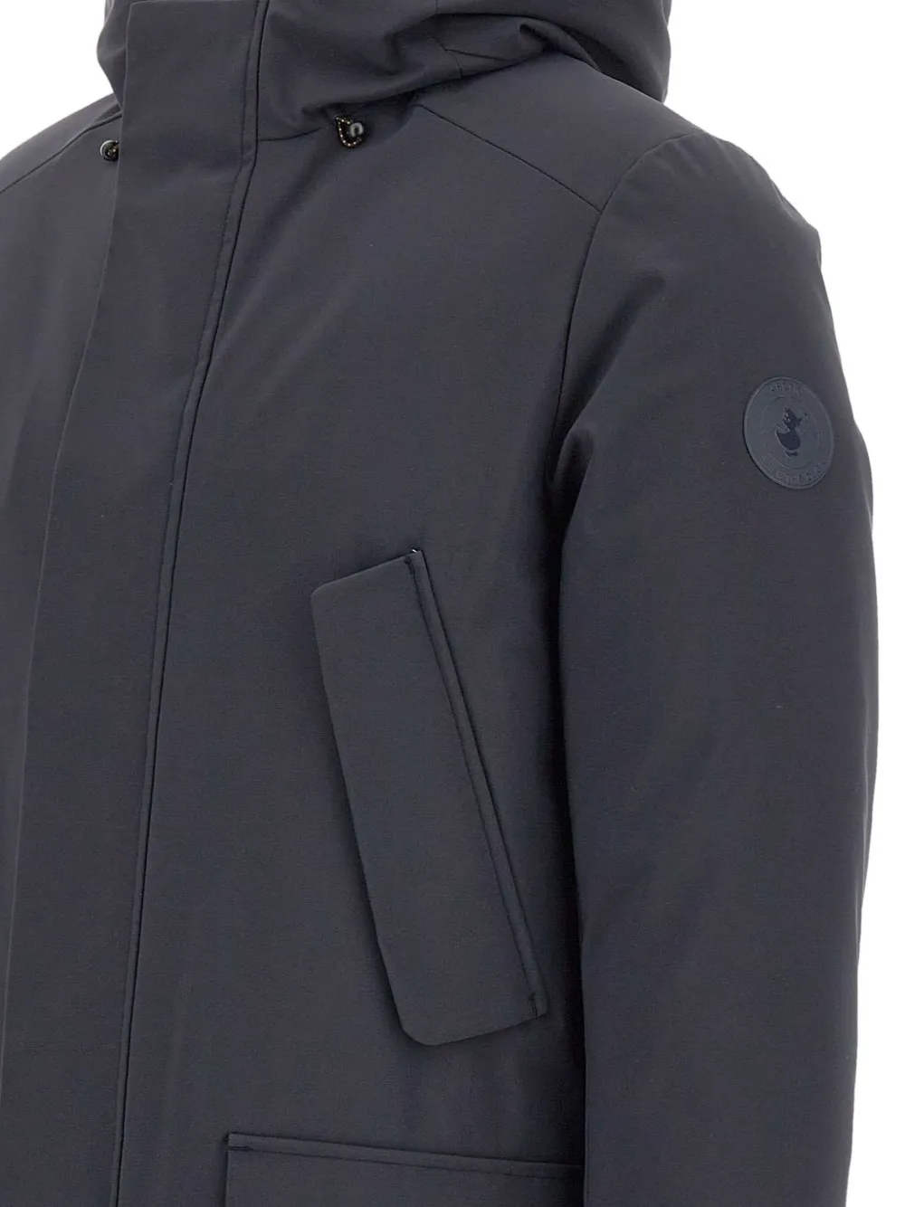 Темно-синий, регулируемый капюшон, стоячий воротник, пояс на кулиске, множество карманов, нашивка с логотипом