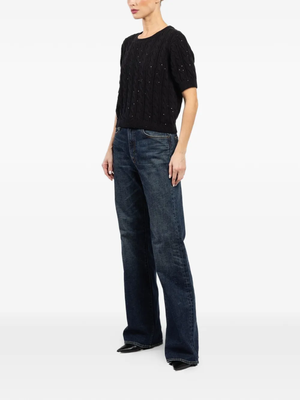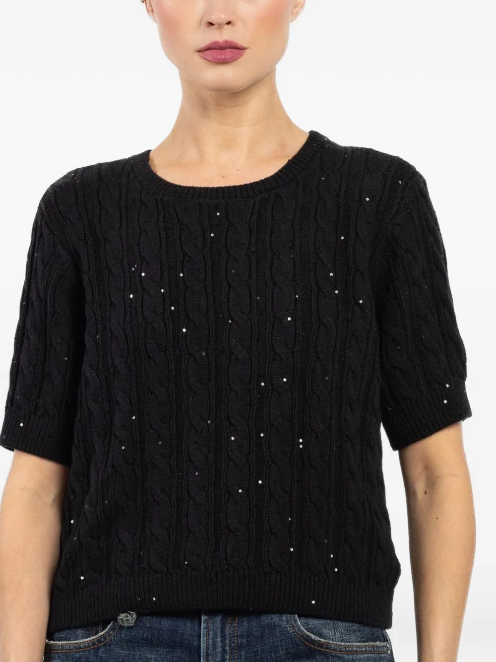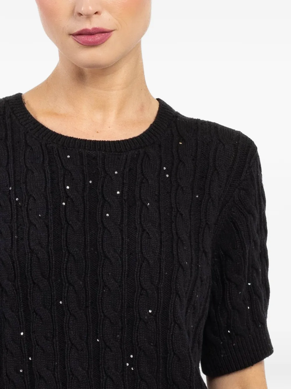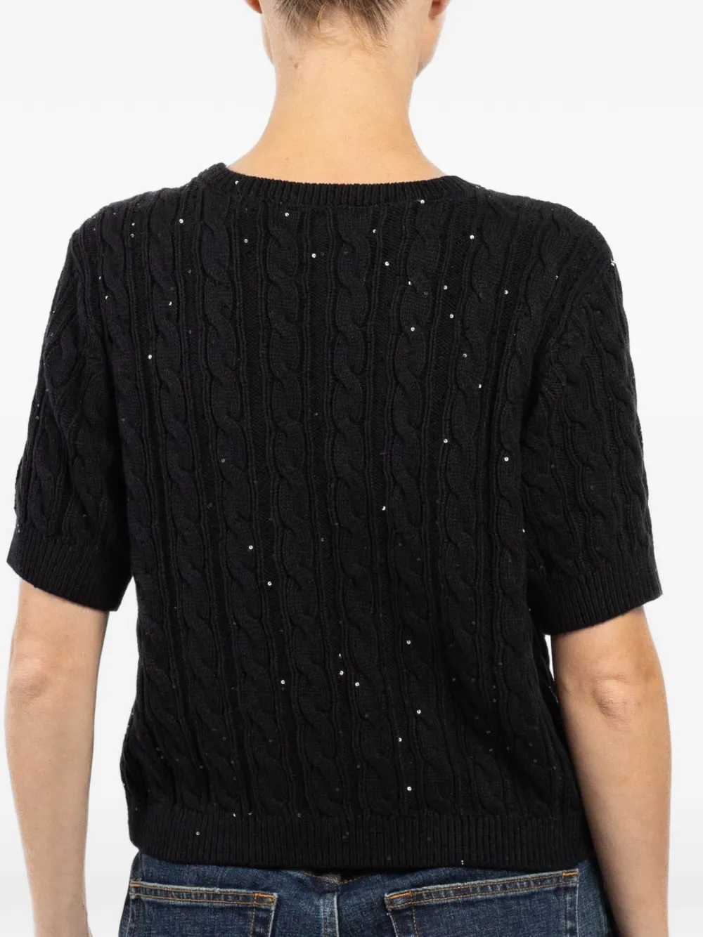 Черный джемпер вязаной фактуры с круглым вырезом, короткими рукавами и декоративными элементами