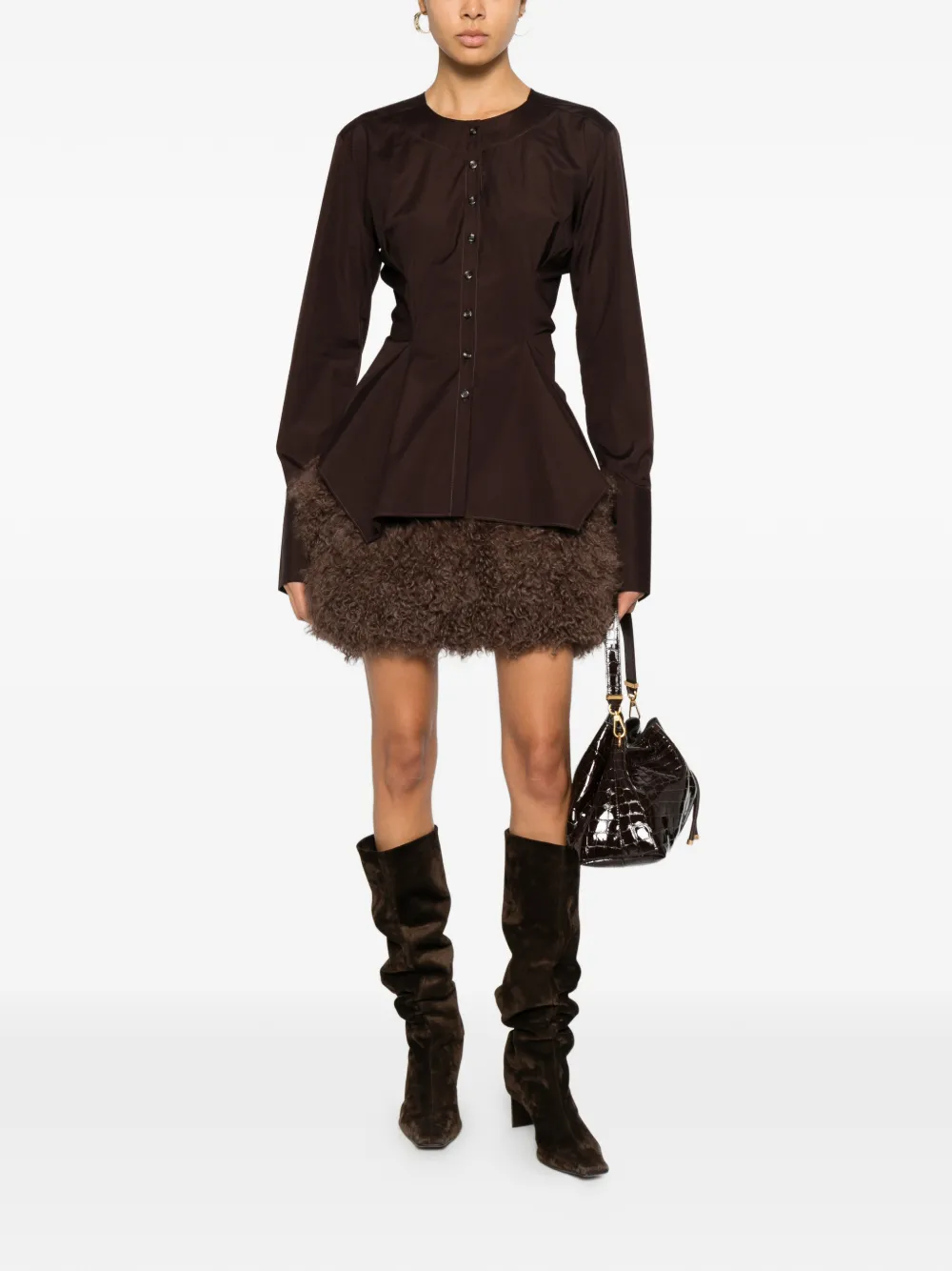 Сливовый цвет, застежка на пуговицы, длинные рукава, расклешенный подол