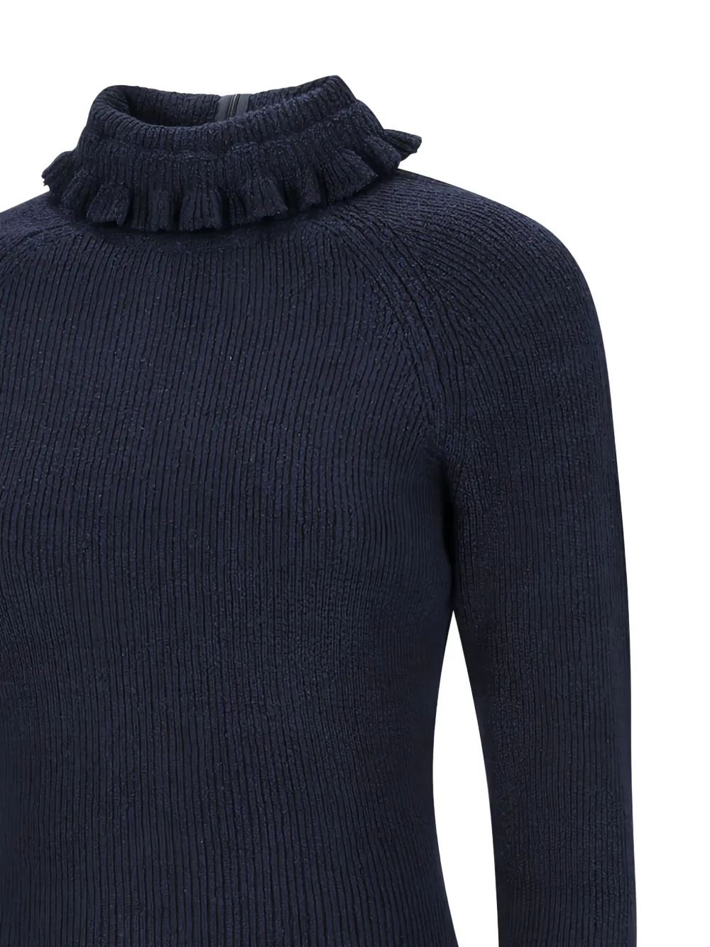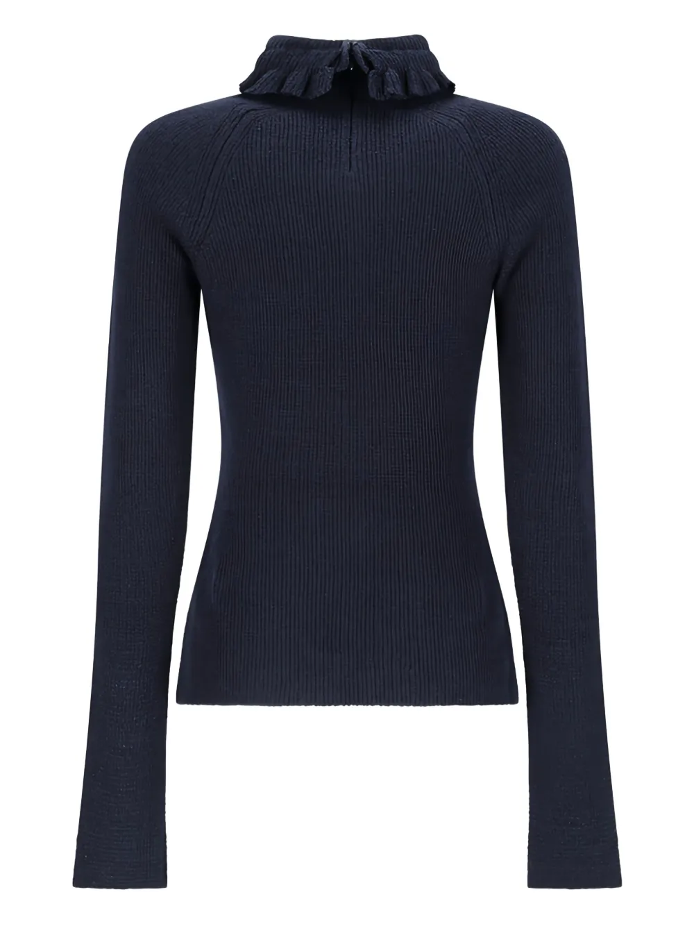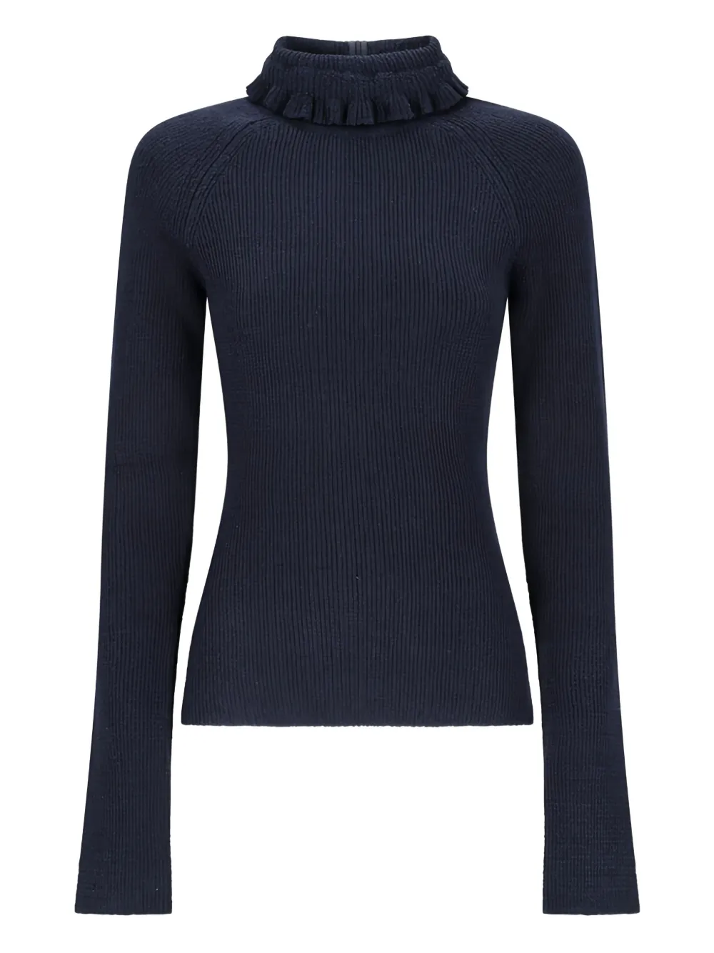 Темно-синий вязаный топ в рубчик с оборками, высоким воротом, длинными рукавами и застежкой-молнией сзади