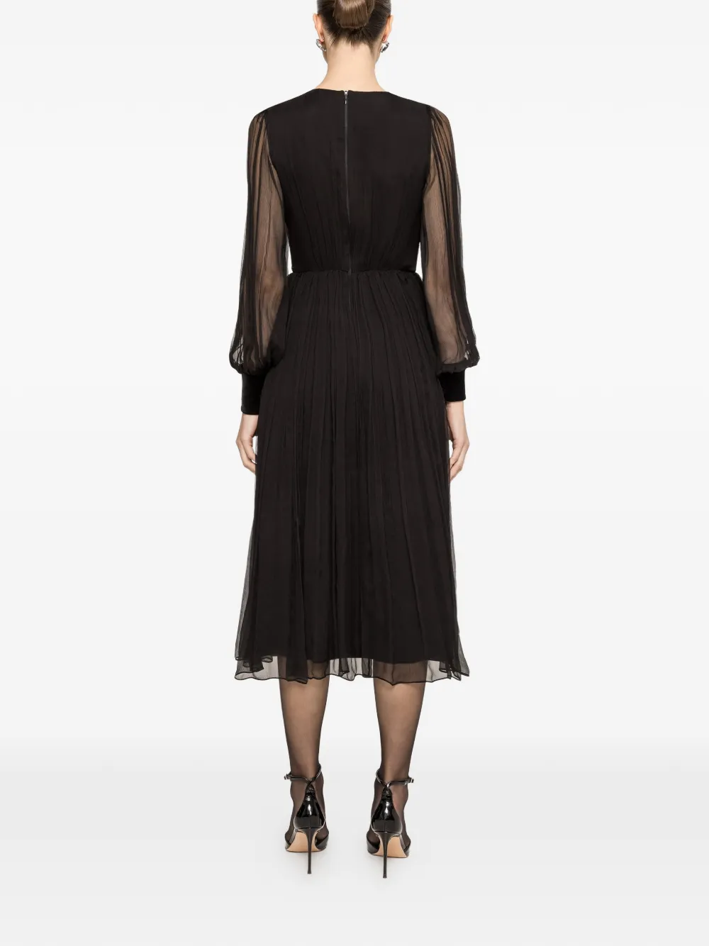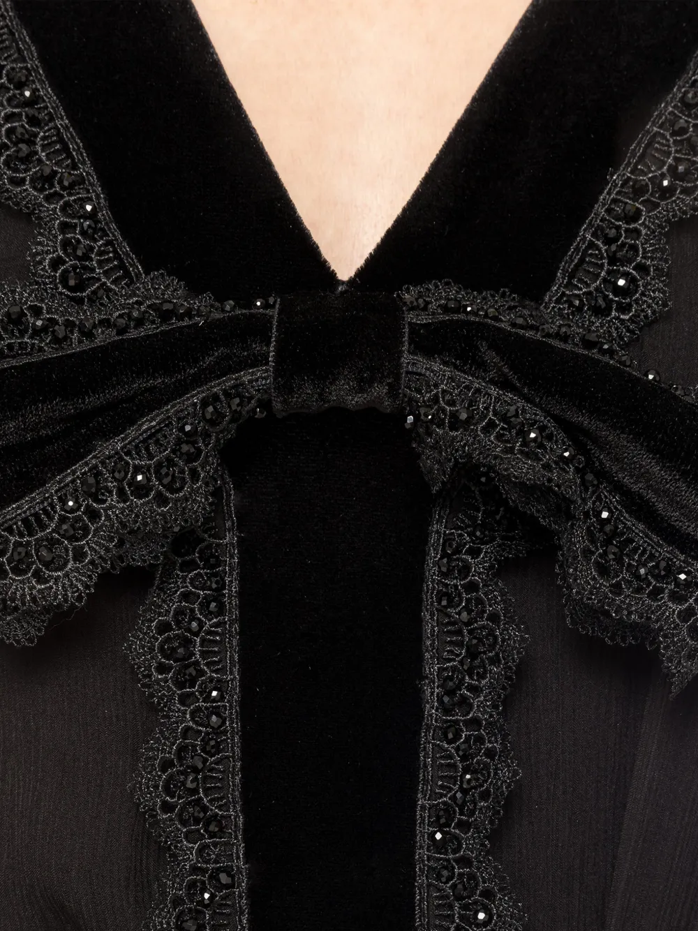Черная отделка кружевом, V-образный вырез, длинные рукава, плиссированная юбка, бант