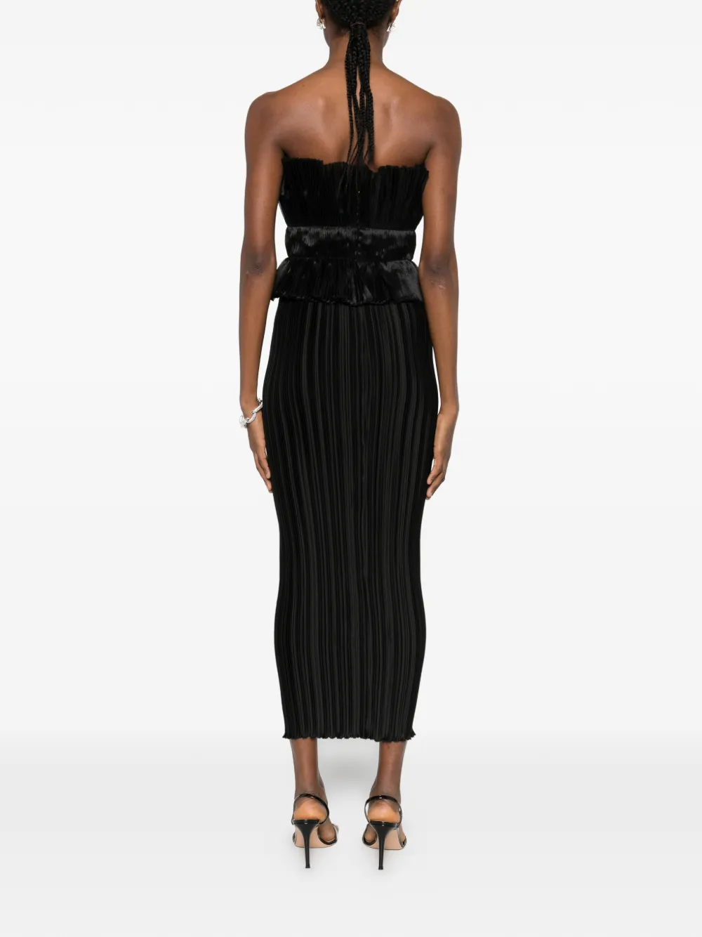 Черное плиссированное платье без бретелек с оборками