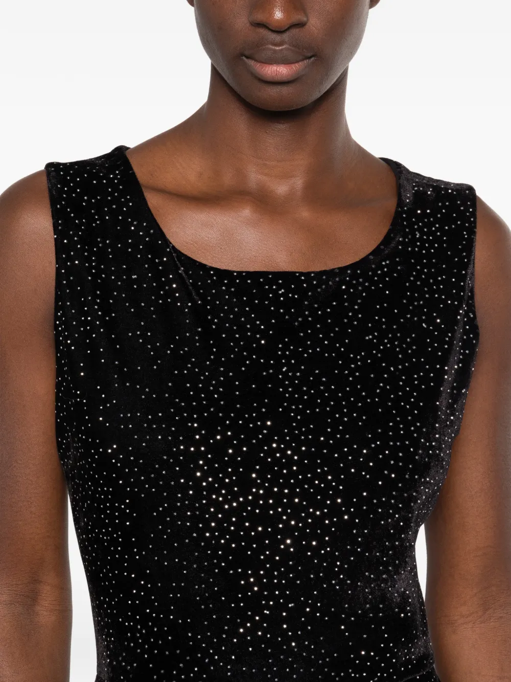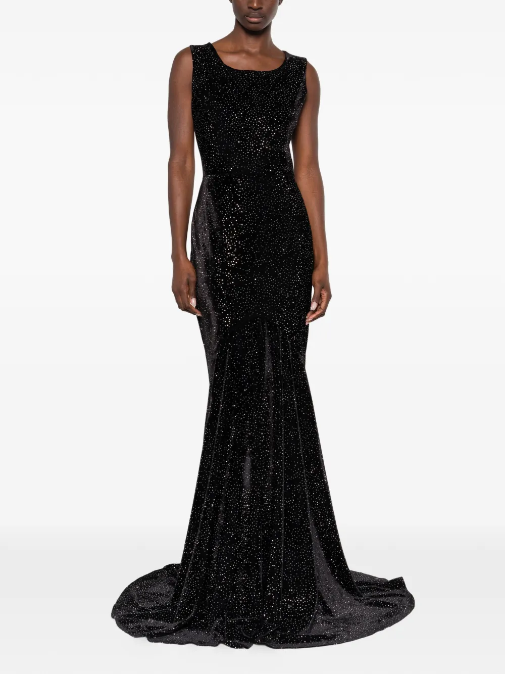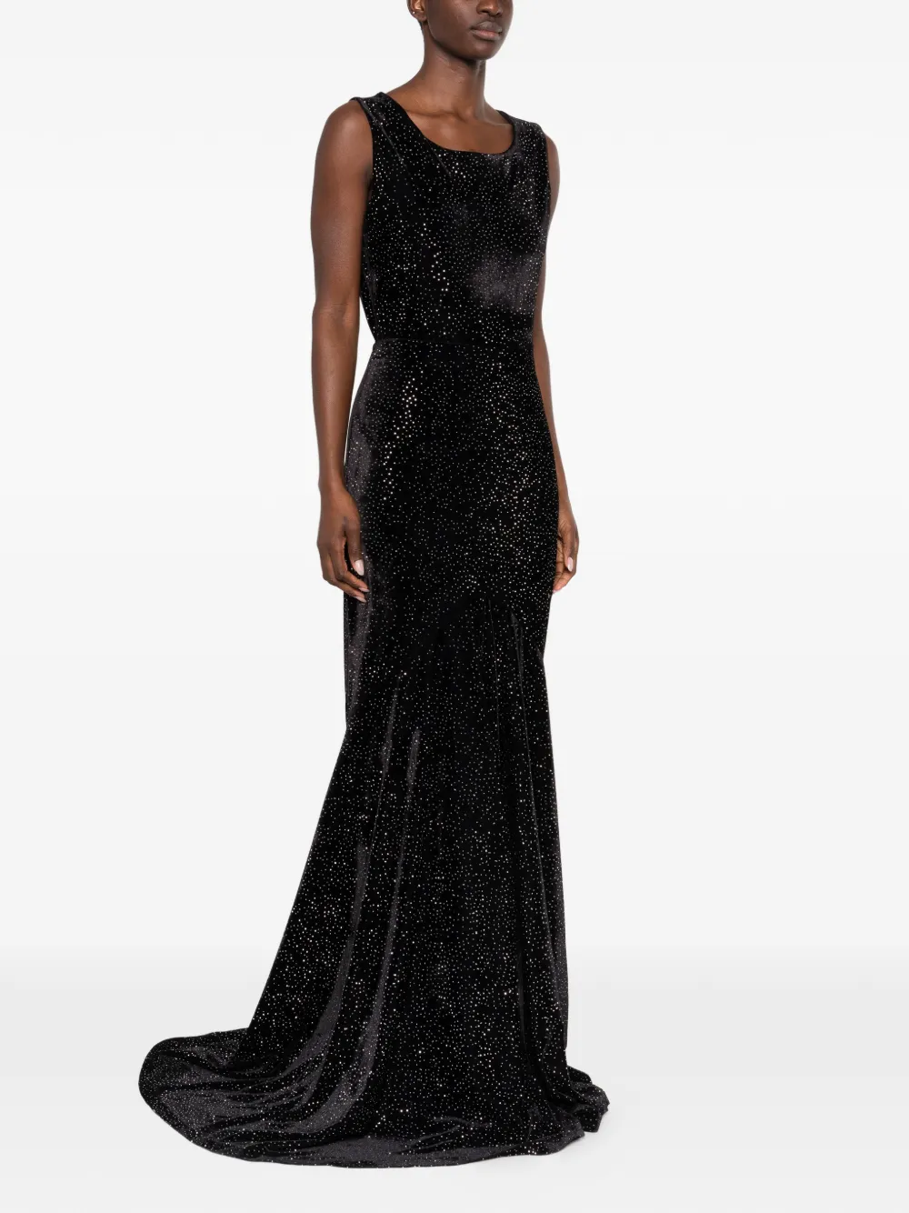 Черное платье без рукавов в пол с круглым вырезом, открытой спиной и украшением стразами