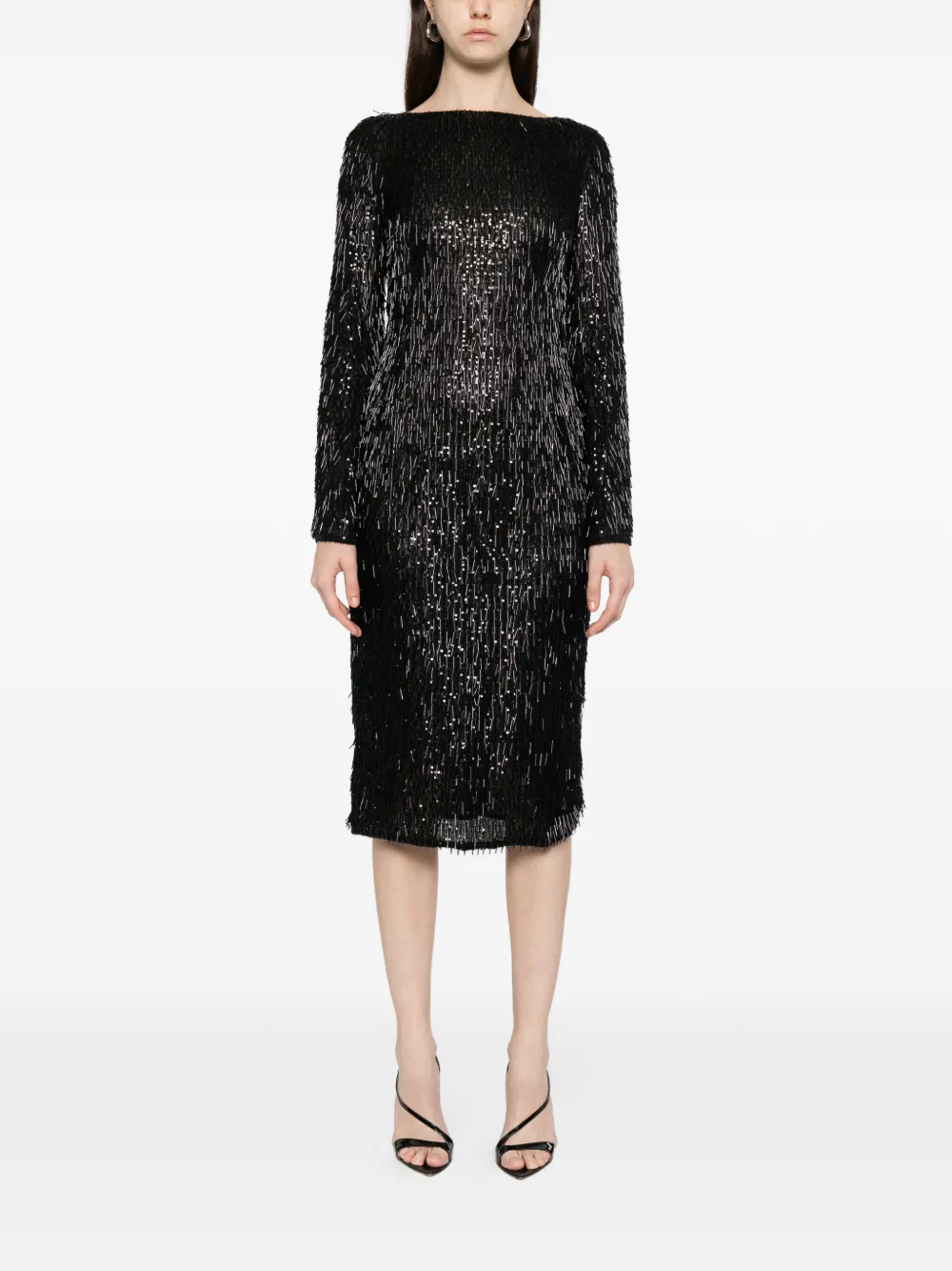 Черная вышивка пайетками, длинные рукава, открытая спина